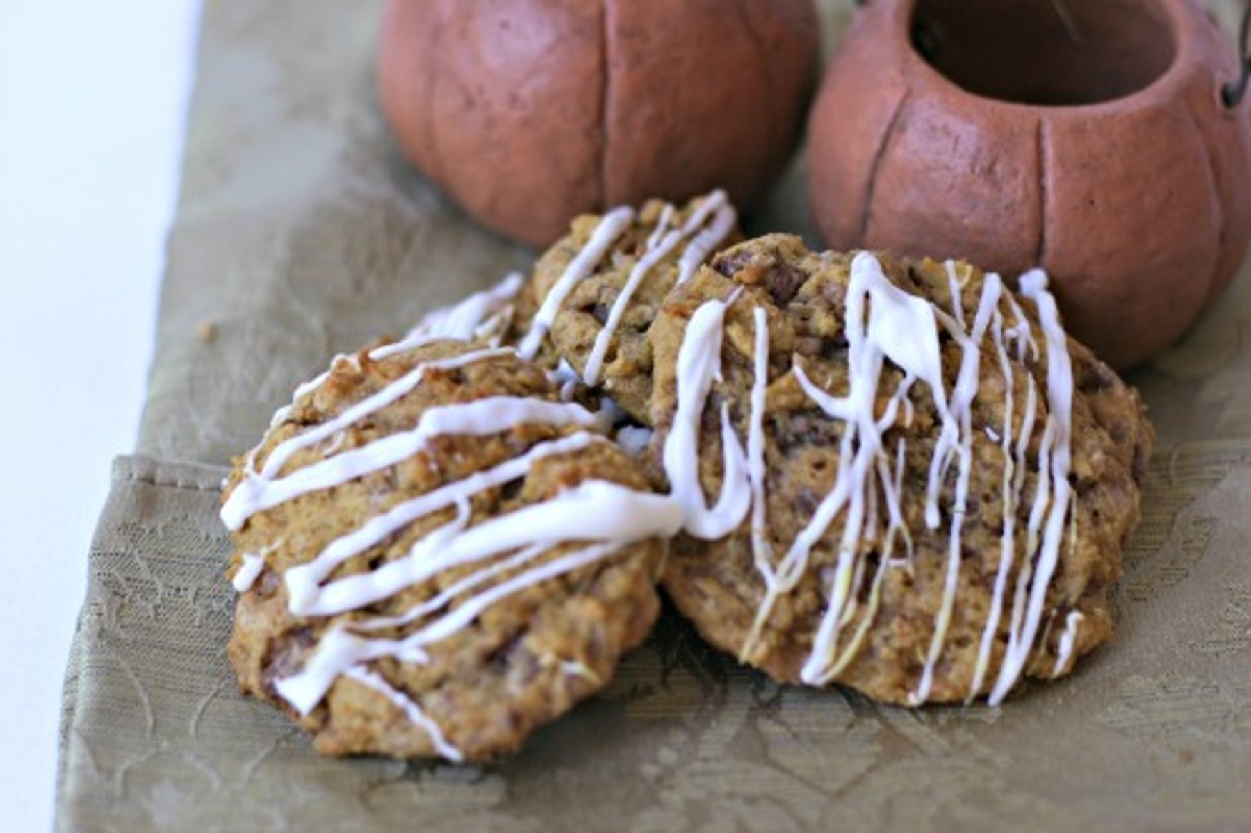 Pumpkin cookies with toffee bits and a white chocolate drizzle.