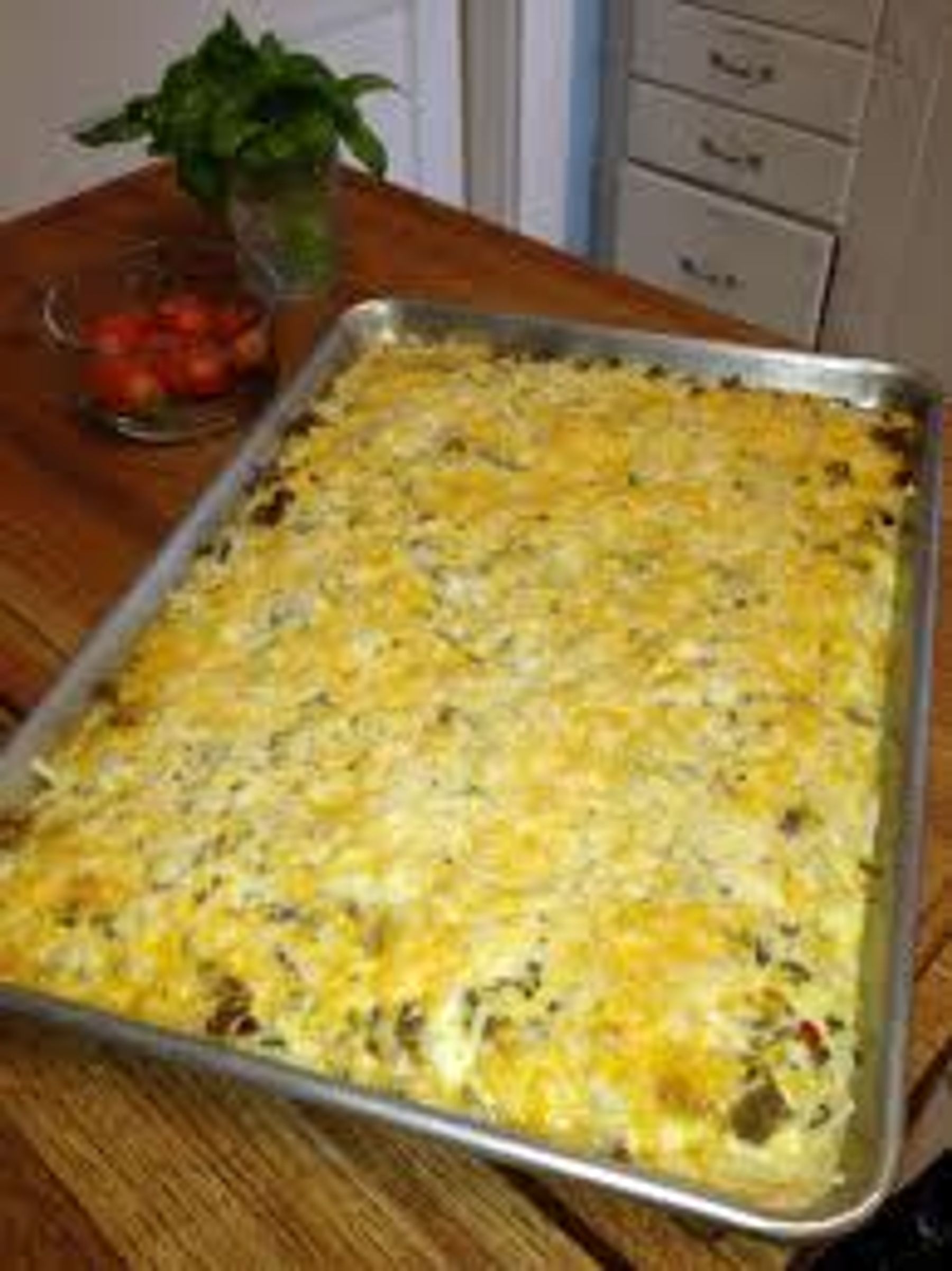 Hash browns covered in egg, ham, cheese, onions, tomatoes, and Mushrooms. Its perfect for serving guests at breakfast or brunch!