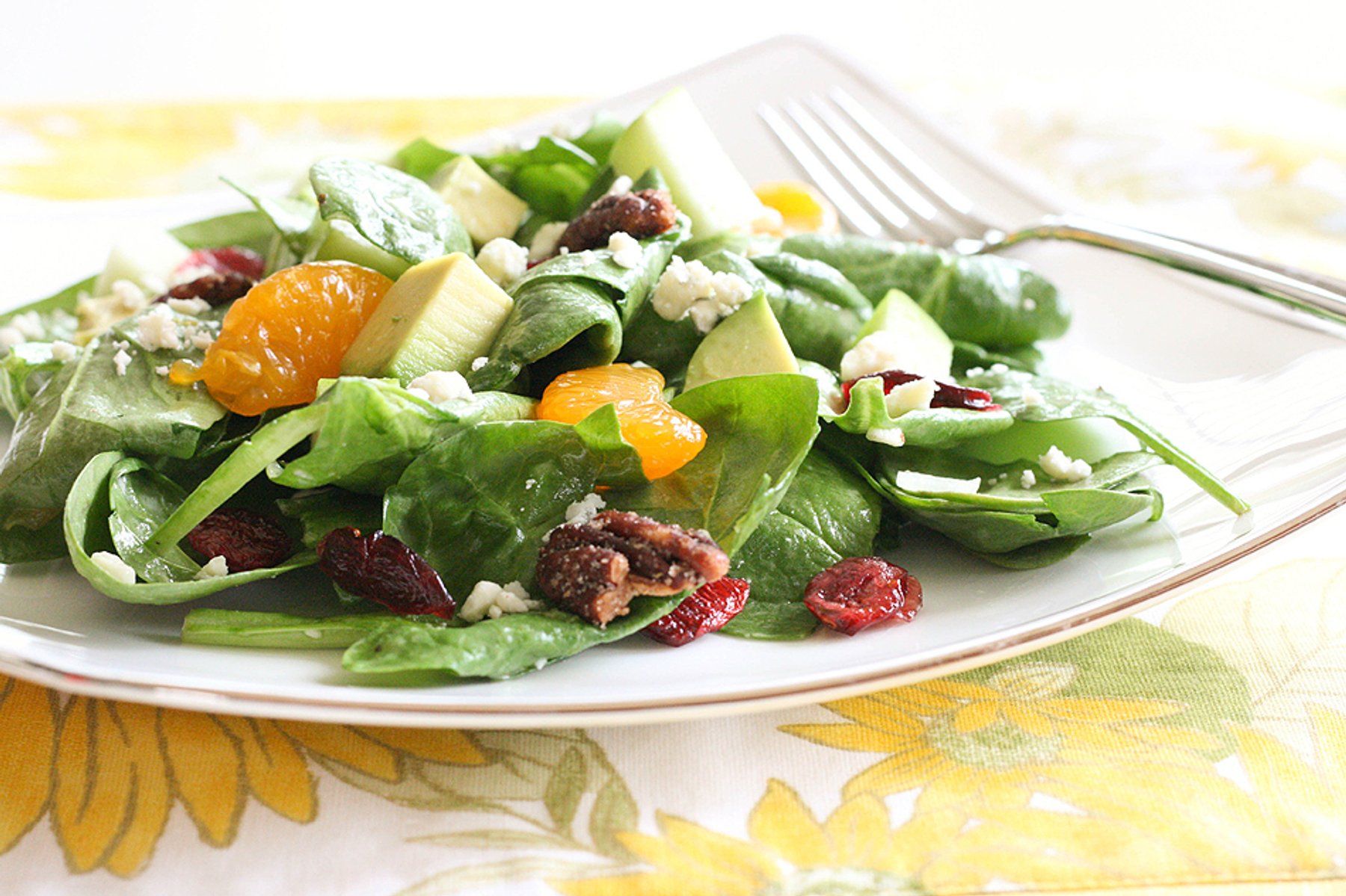 Place the baby spinach in a large bowl and top with apples, avocados, mandarin oranges, cranberries, candied pecans,...