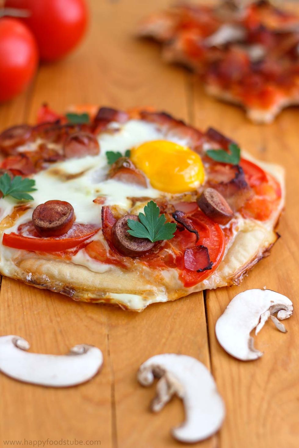 Breakfast pizza with bacon, mushrooms, beans and eggs is the way to start your day! All your favorite things on a pizza crust! It’s hard to resist this deliciousness!