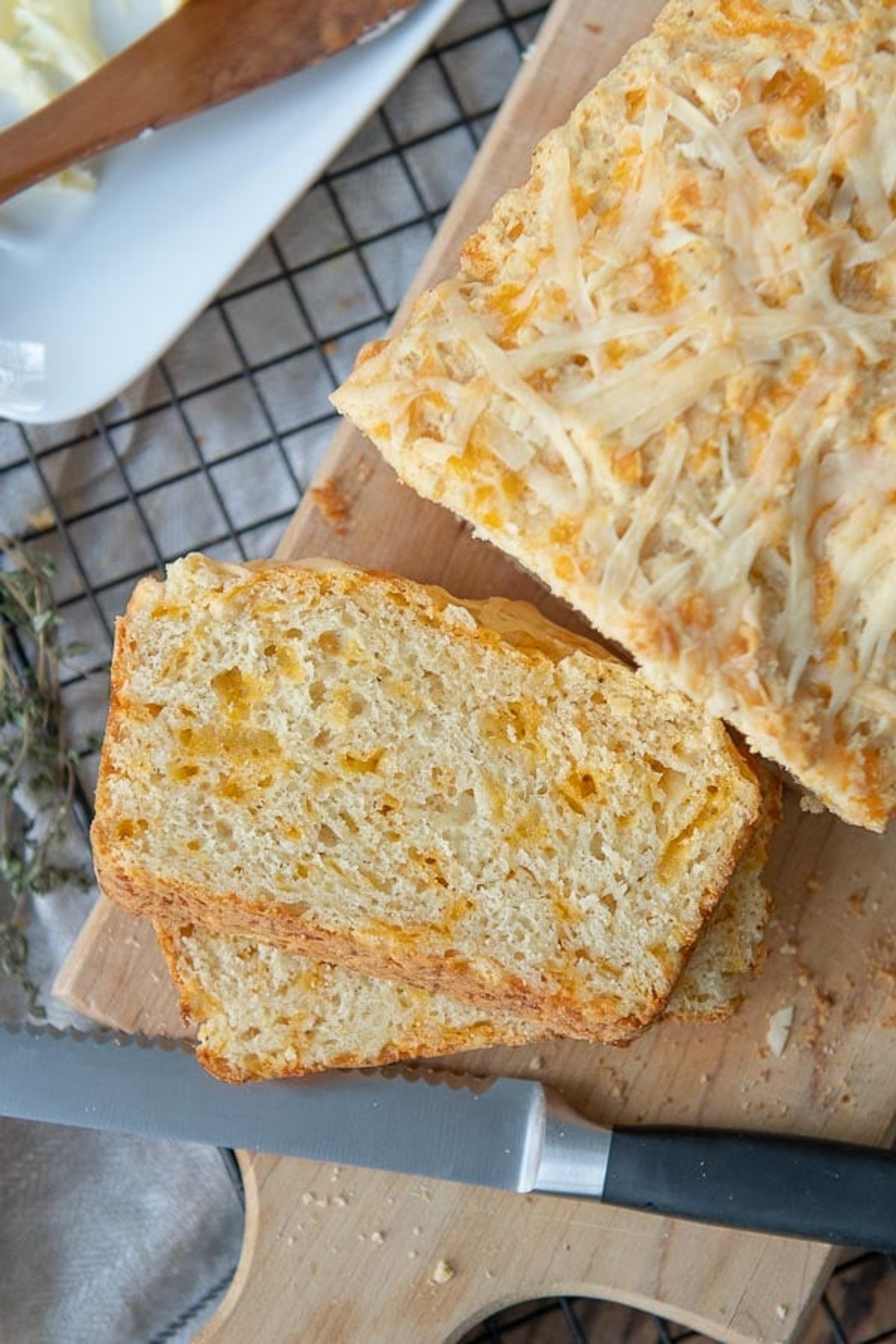 Quick Cheese Bread is a savory cheesy cheddar loaf bread with a touch of garlic flavor. It's easy to make and mixes up in minutes without yeast or kneading!