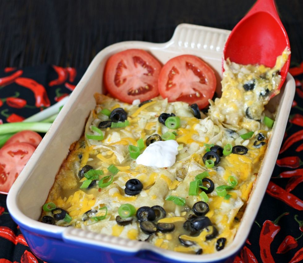 Arrange a third of the tortillas into the bottom of the dish. Spread half of the cubed cheddar cheese, onions and olives over...