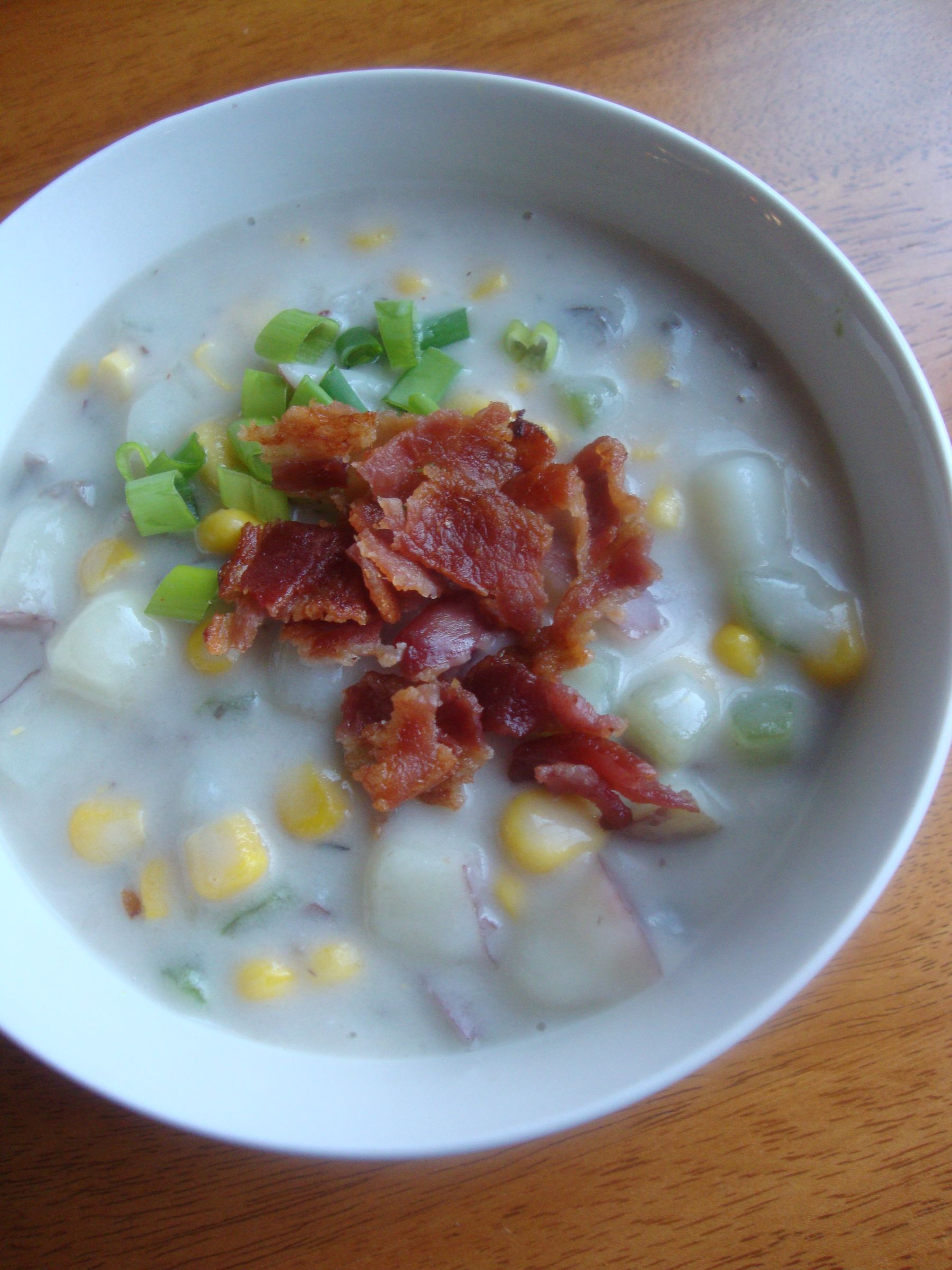 This delicious chowder is loaded with corn, potatoes, celery, onion AND bacon too! Besides being delicious, the next best thing about this chowder recipe is how quick and easy it is to make. You can literally have this homemade chowder ready in about 25 minutes from start to finish! While it’s simmering on the stove, you have time to whip up a batch of biscuits!