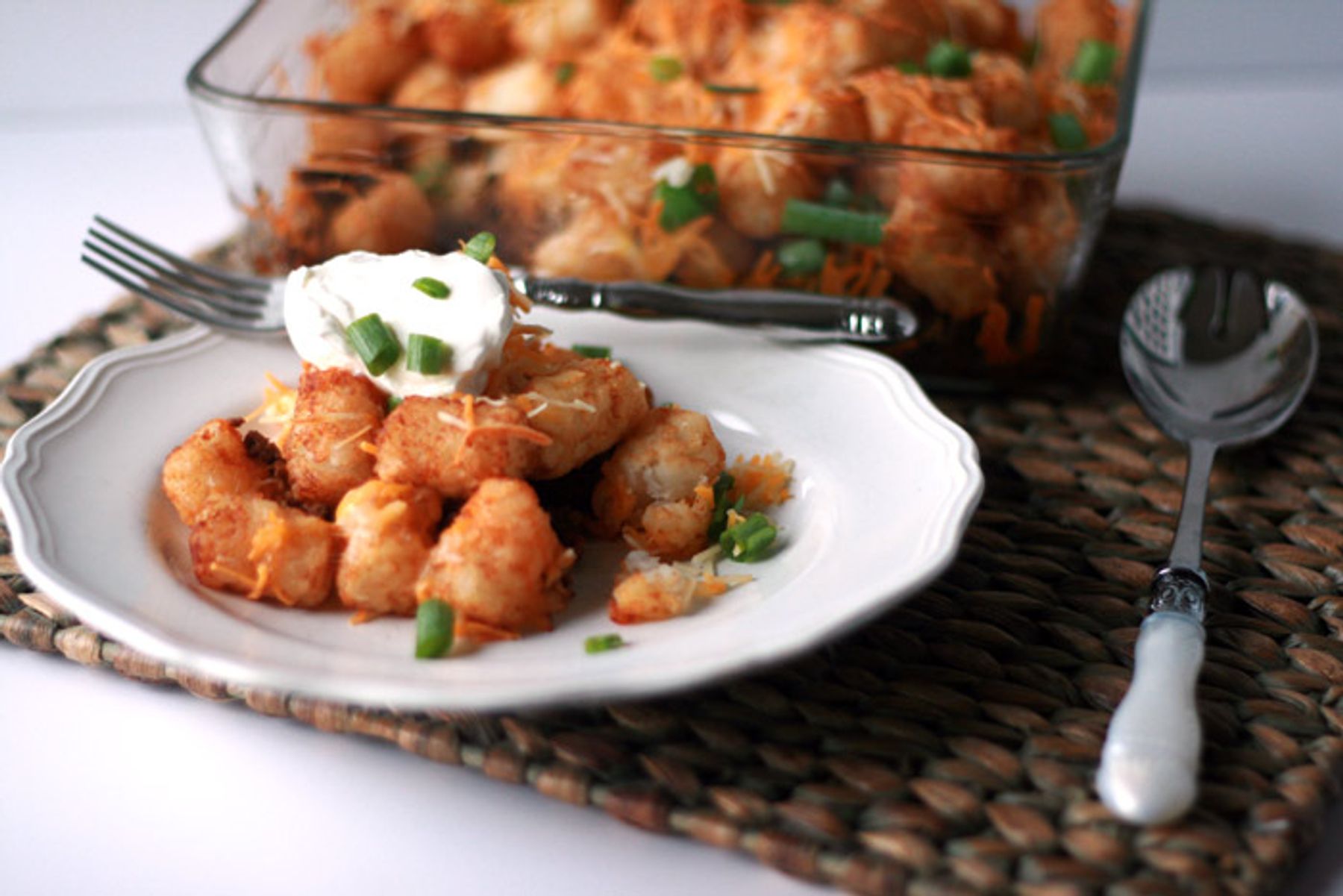 Brown ground beef and mix in taco seasoning and water according to package instructions. Spread in 9×13 pan. Top with layers of cheese and tator tots. I used about 1 1/4 cups of...
