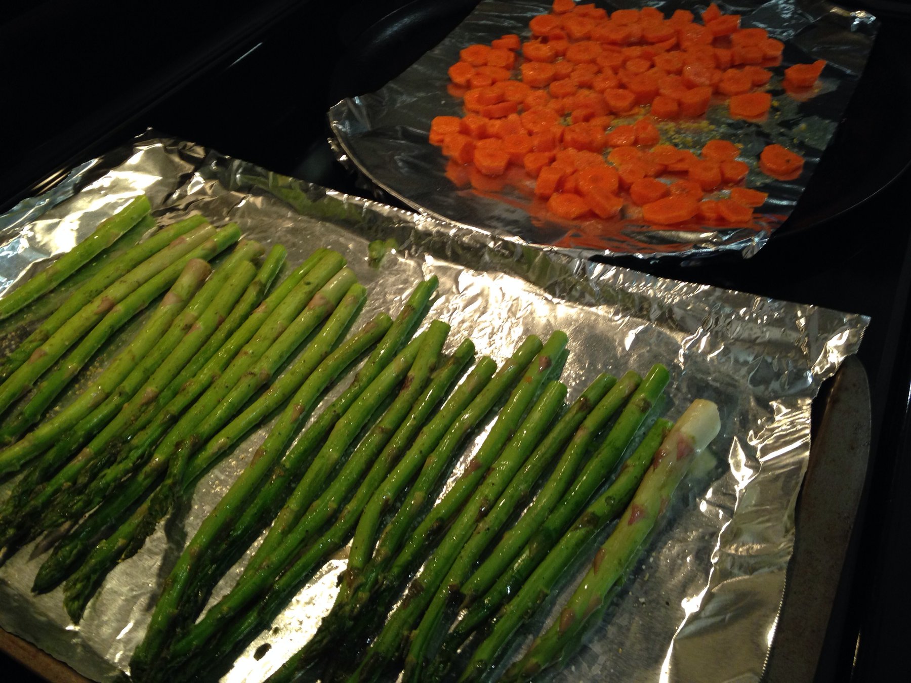 • Preheat oven to 400F. Line baking sheet with aluminum foil. Place carrots and asparagus on baking sheet and drizzle with olive oil, lemon pepper, garlic salt, pepper and thyme. Toss to...