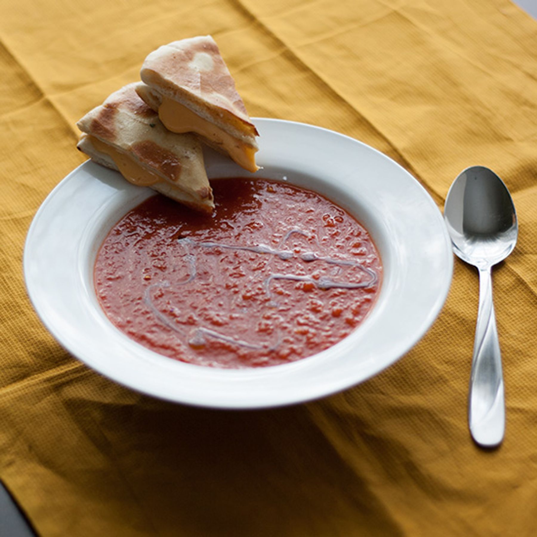 This tomato soup is made in a flash from pantry staples. Only 80 calories plus 4 g of fiber!