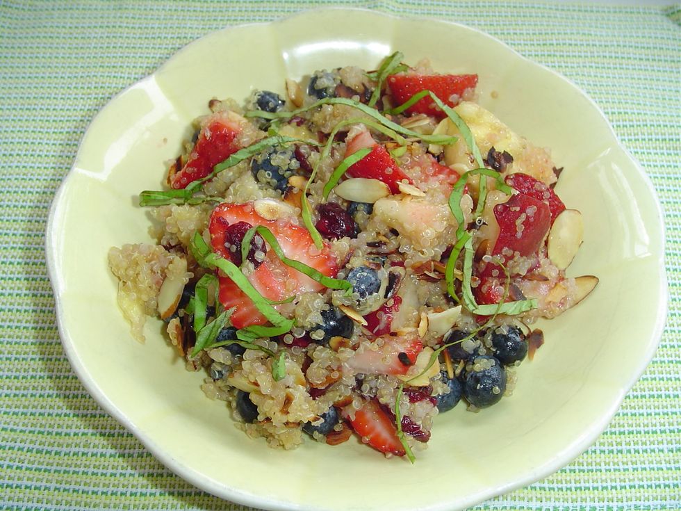 Place the quinoa, fruits, cranberries, almonds and basil leaves in a large bowl. Mix the lime juice, zest and honey together and pour over the salad. Toss and serve.