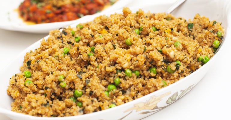 Quinoa Pilaf with Cumin & Peas is a versatile dish that can double as a vegetarian main course or a side dish paired with Chicken Rollades With Tomato Roasted Red Pepper Sauce for example.