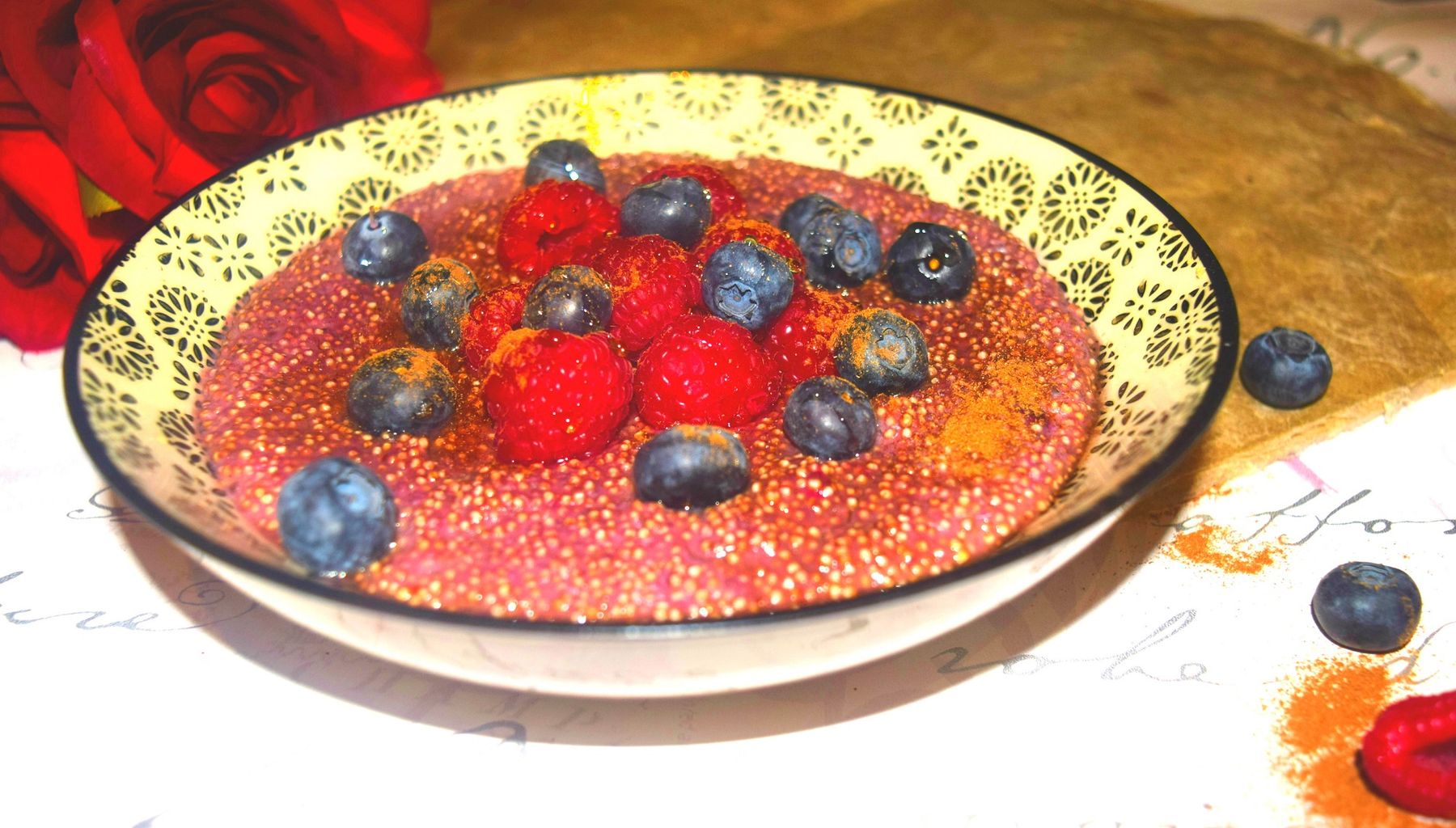 This delicious quinoa pudding is super easy to make and tastes fantastic. It has a similar taste to rice pudding but is really healthy and nutritious. I’ve added berries into mine to cook with the quinoa, although it tastes great without them too. I prefer to eat this warm but it can also be refrigerated and served cold. Hope you enoy! :)