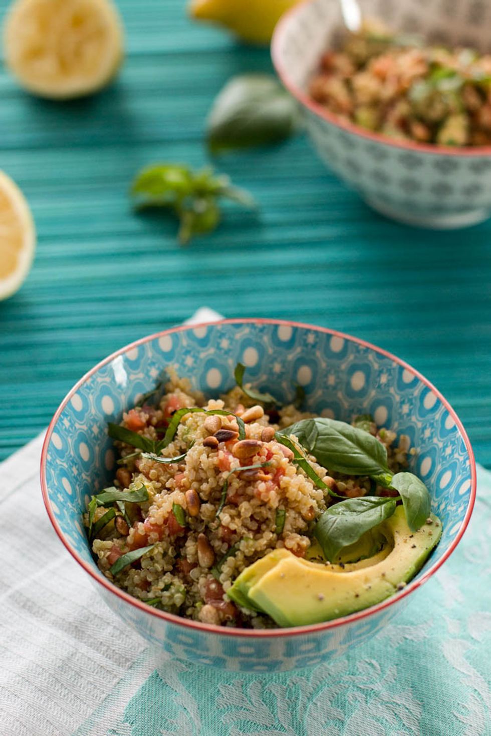 Cook quinoa according to instructions in vegetable broth. Cool down before assembling the salad.