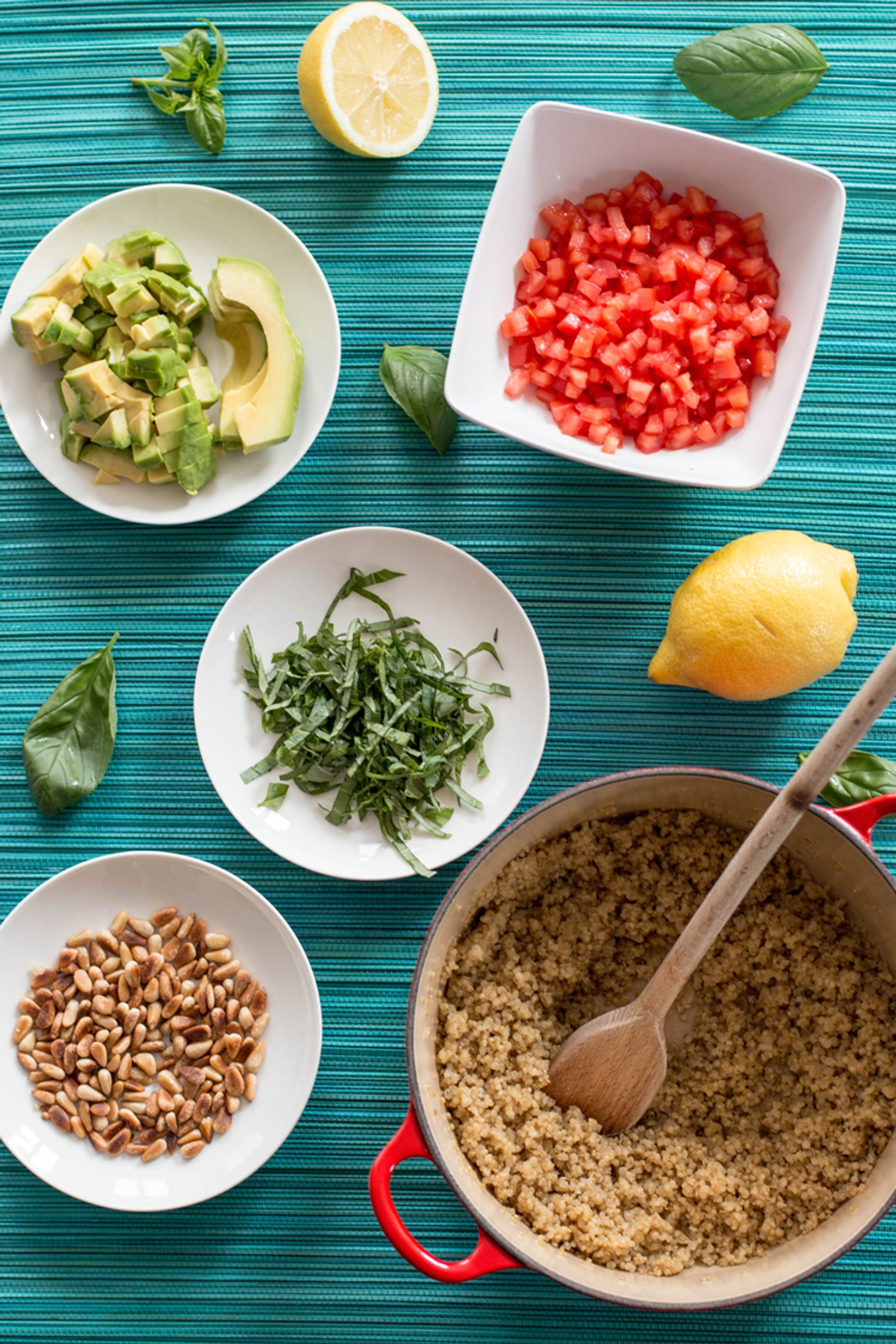 Cook quinoa according to instructions in vegetable broth. Cool down before assembling the salad.