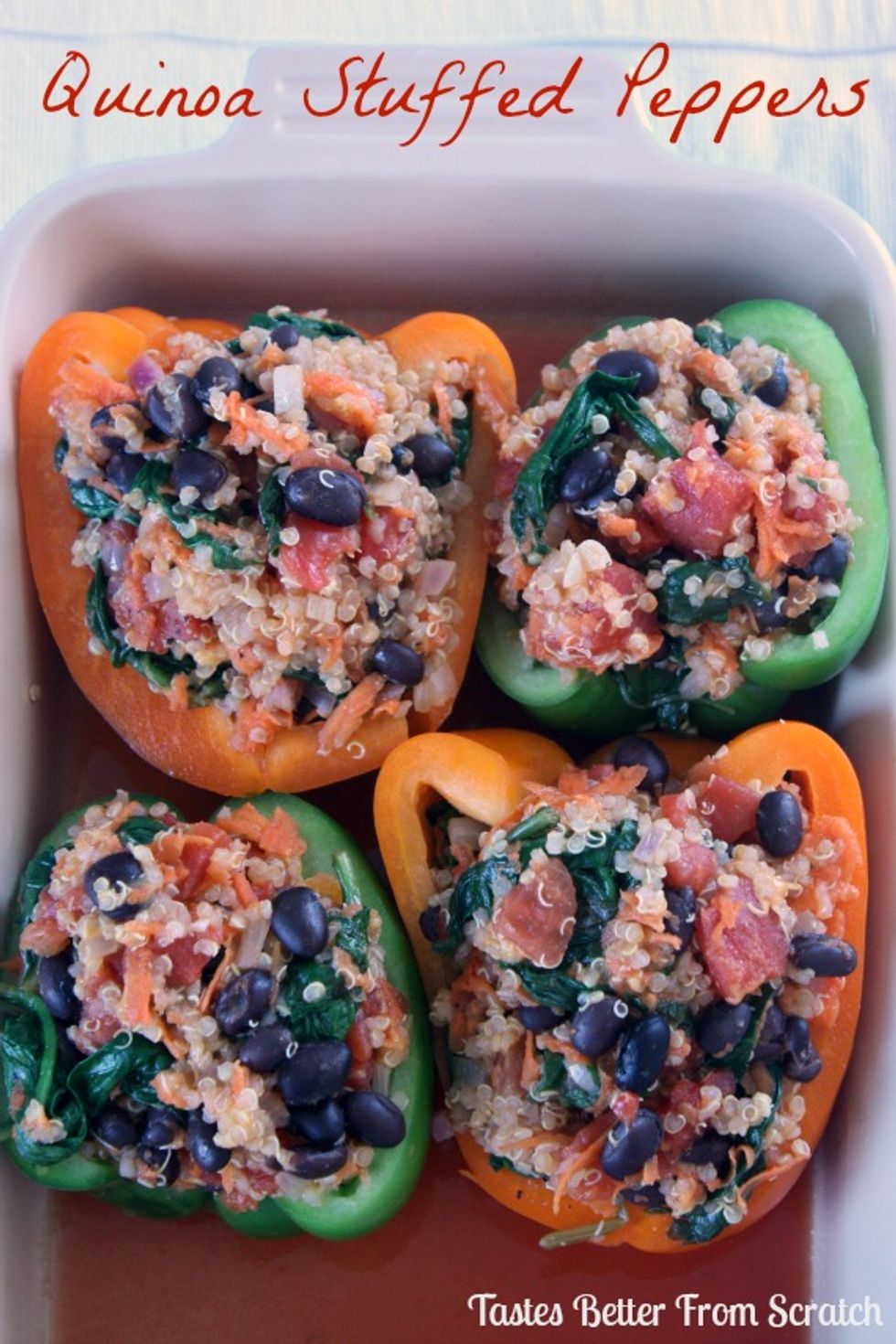 These quinoa stuffed bell peppers are perfect for meatless meal because they'll fill you up and they're packed with all the good stuff like spinach, tomatoes, black beans, carrots and cheese!