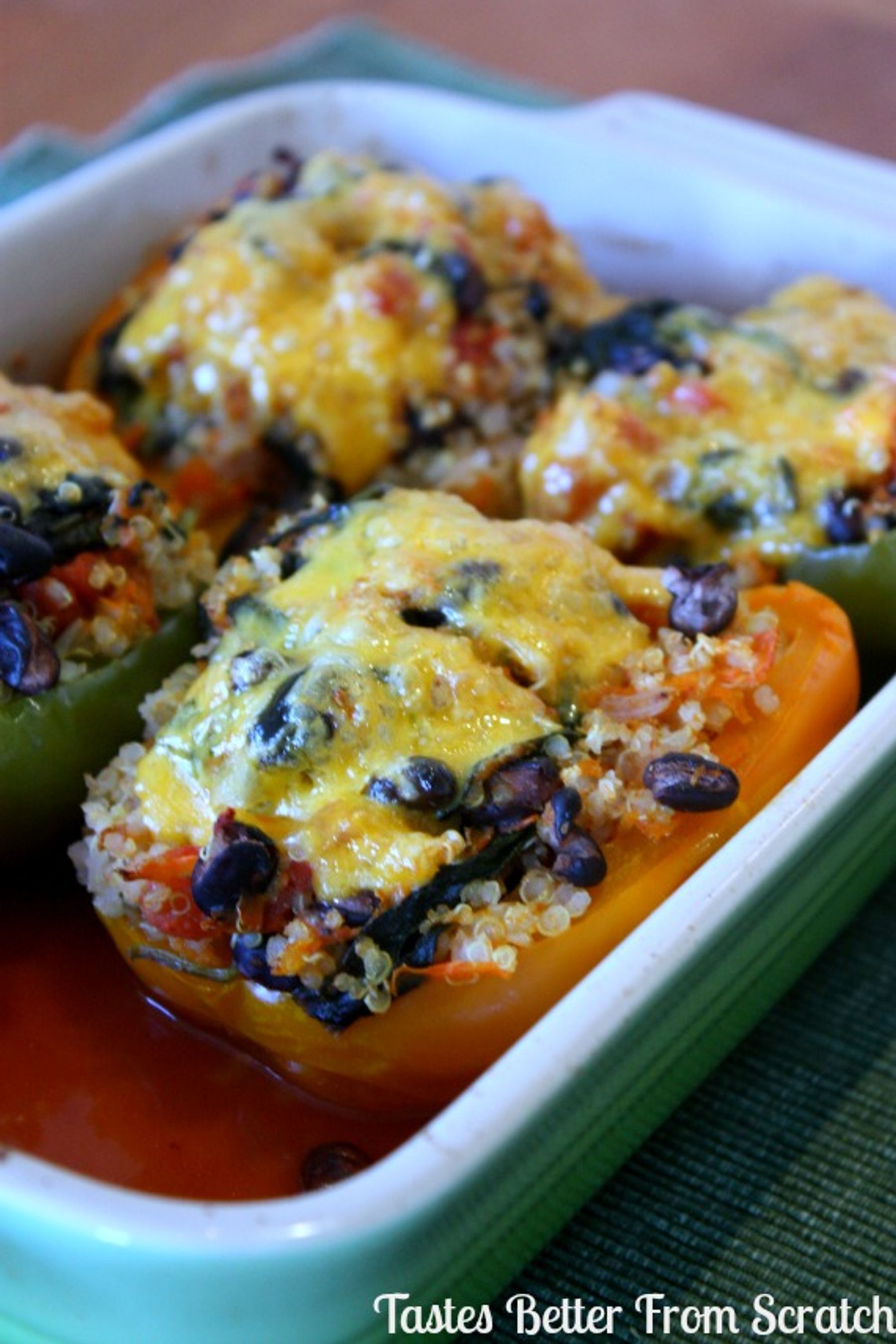 These quinoa stuffed bell peppers are perfect for meatless meal because they'll fill you up and they're packed with all the good stuff like spinach, tomatoes, black beans, carrots and cheese!