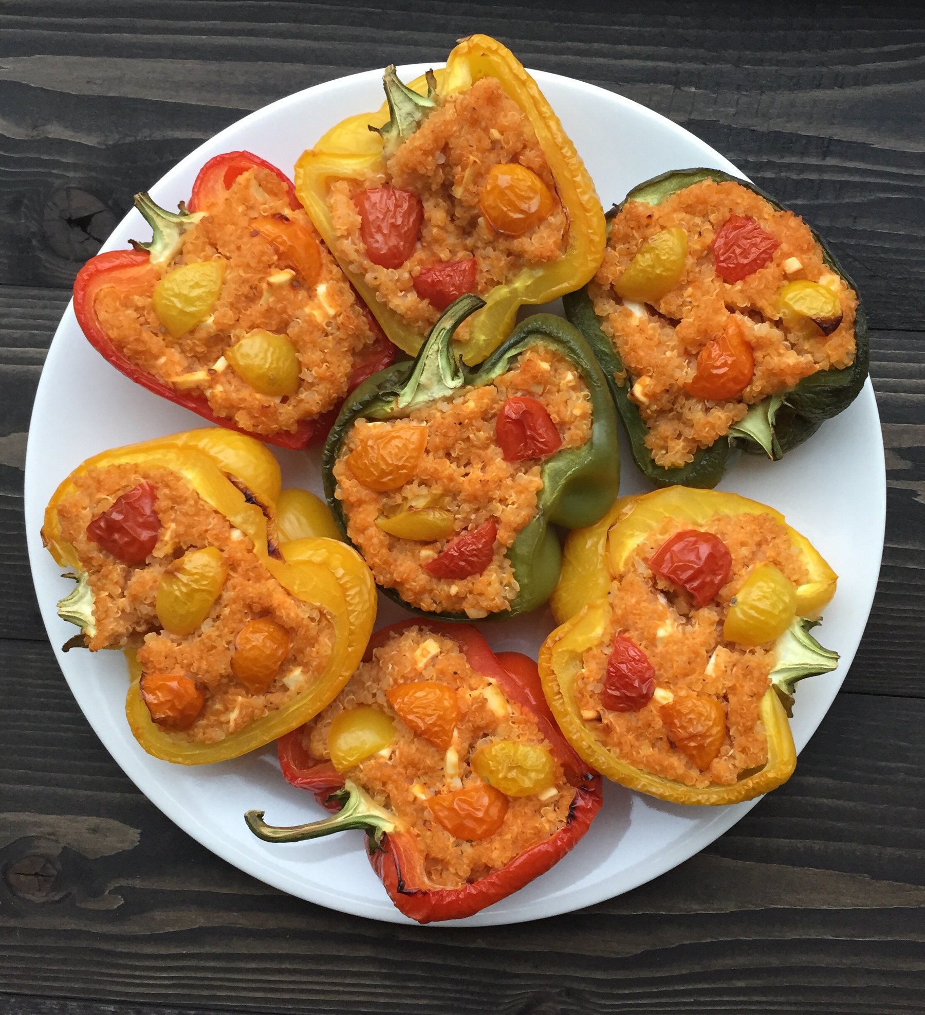 Quinoa Stuffed Peppers in a Roasted Pepper and Greek Yogurt Sauce