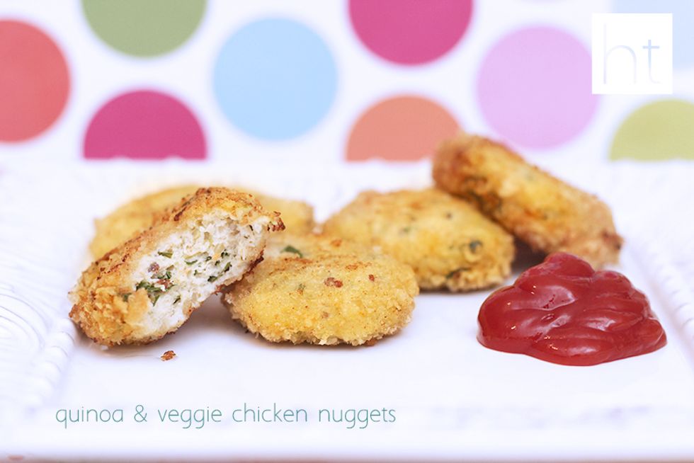Baked chicken nuggets packed with everything good and nutritious. Kale and quinoa disguised under a crunchy Parmesan crust.