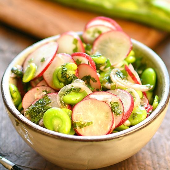 For many of us the radish will have been the first encounter we had, as children, with the magical world of vegetable growing. Radishes are very quick to mature – important when you are a small and impatient person – and can also be sown over and again throughout the long growing season. In this simple recipe they are combined with one of my favourite early spring crops, the broad bean, to create a colourful, vibrant and very tasty salad.