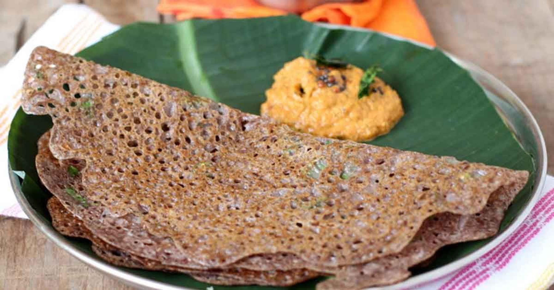 A fermented recipe of ragi or finger millet dosa made with ragi flour, urad dal and idli rice.
