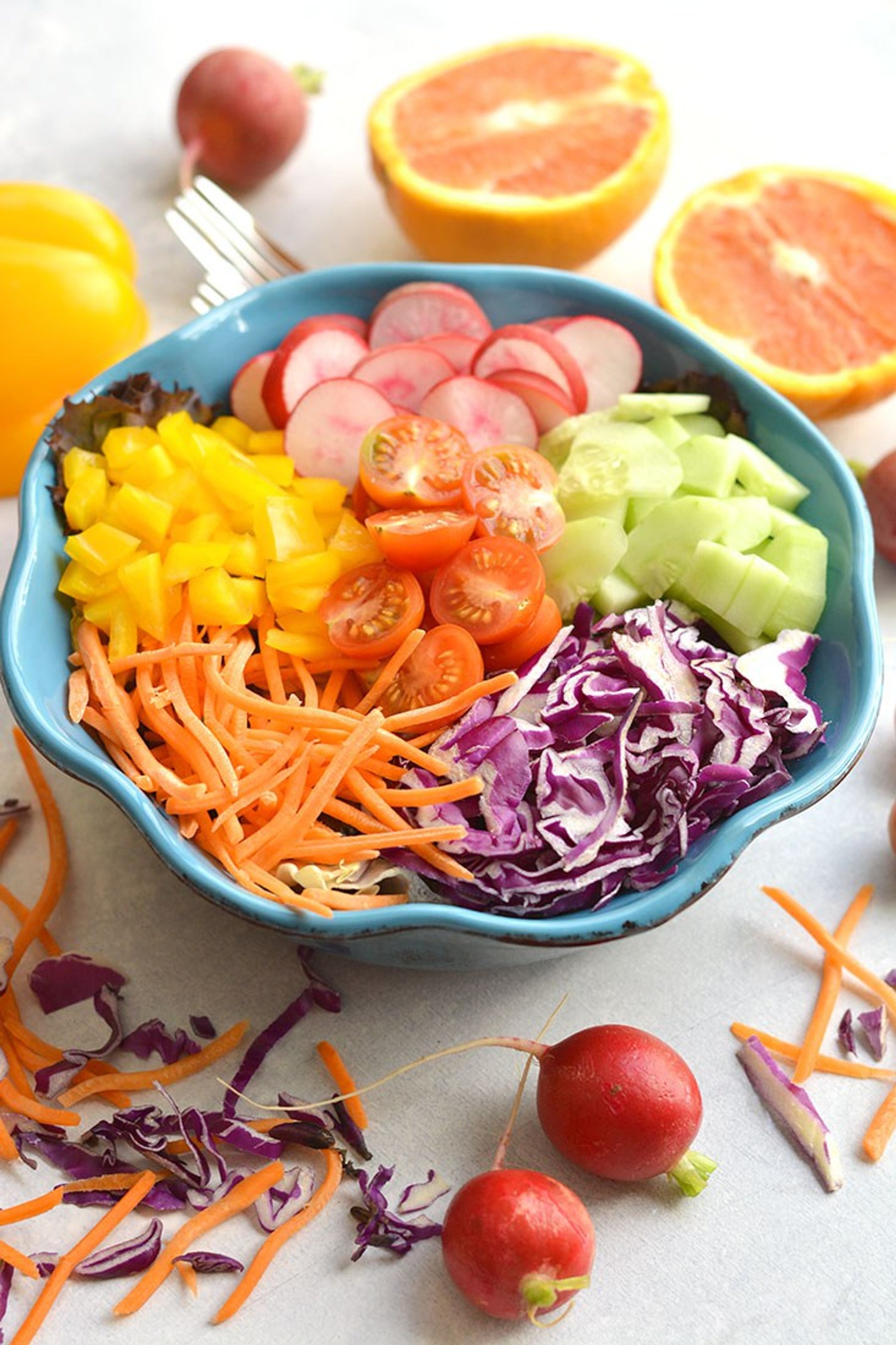 A Rainbow Detox Salad packed with fresh, healthy ingredients and a light orange dressing. Crisp cabbage, radishes, cucumber, and more! Easy to make fresh at home all in one bowl. Just toss and go! Great as a healthy vegetarian main or a side salad for any dish! Paleo + Vegan + Gluten Free + Low Calorie