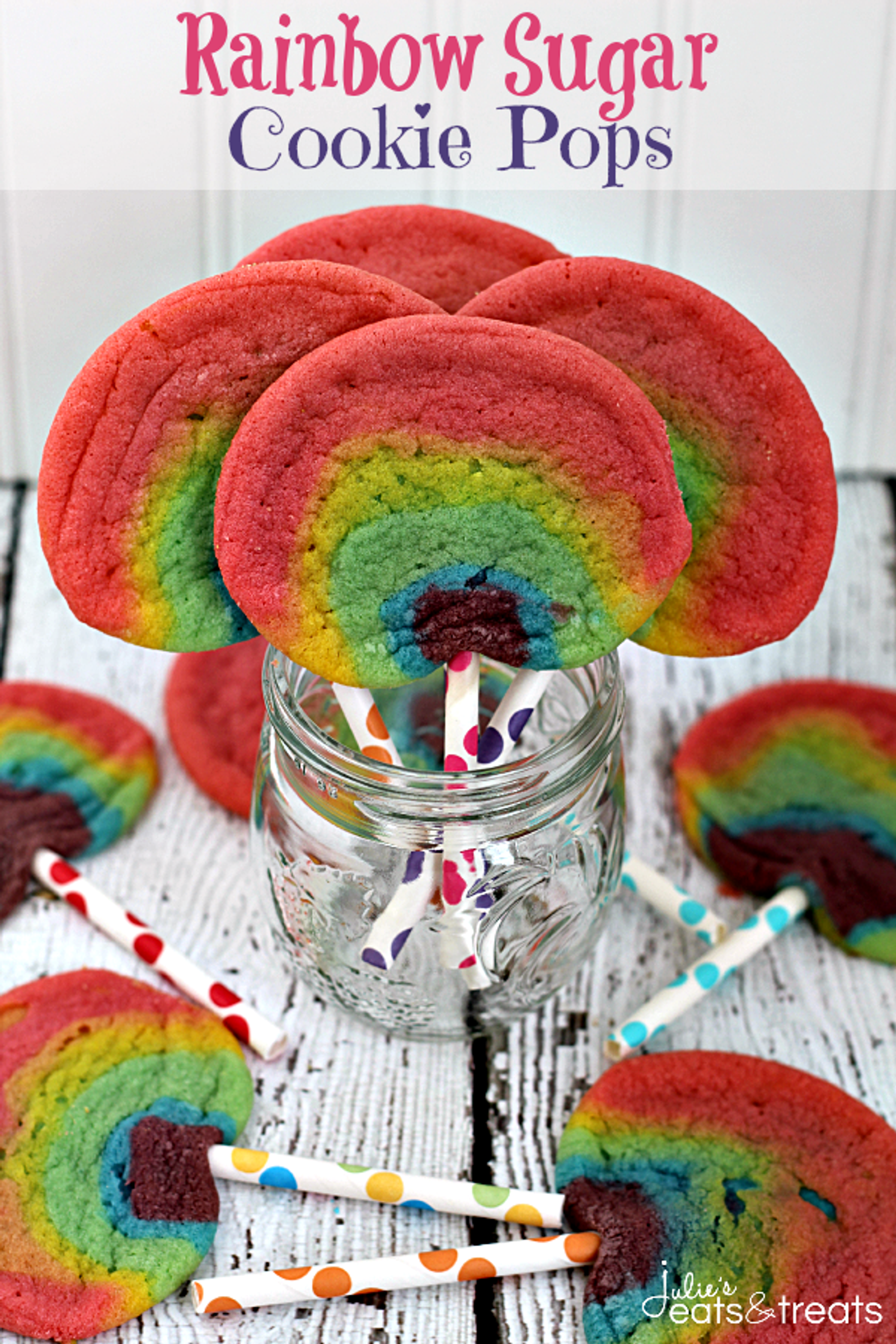 Rainbow Sugar Cookies Pops ~ Super easy and fun cookies that will put a smile on anyone’s face! Grab your Pillsbury Sugar Cookie Dough and get to work!