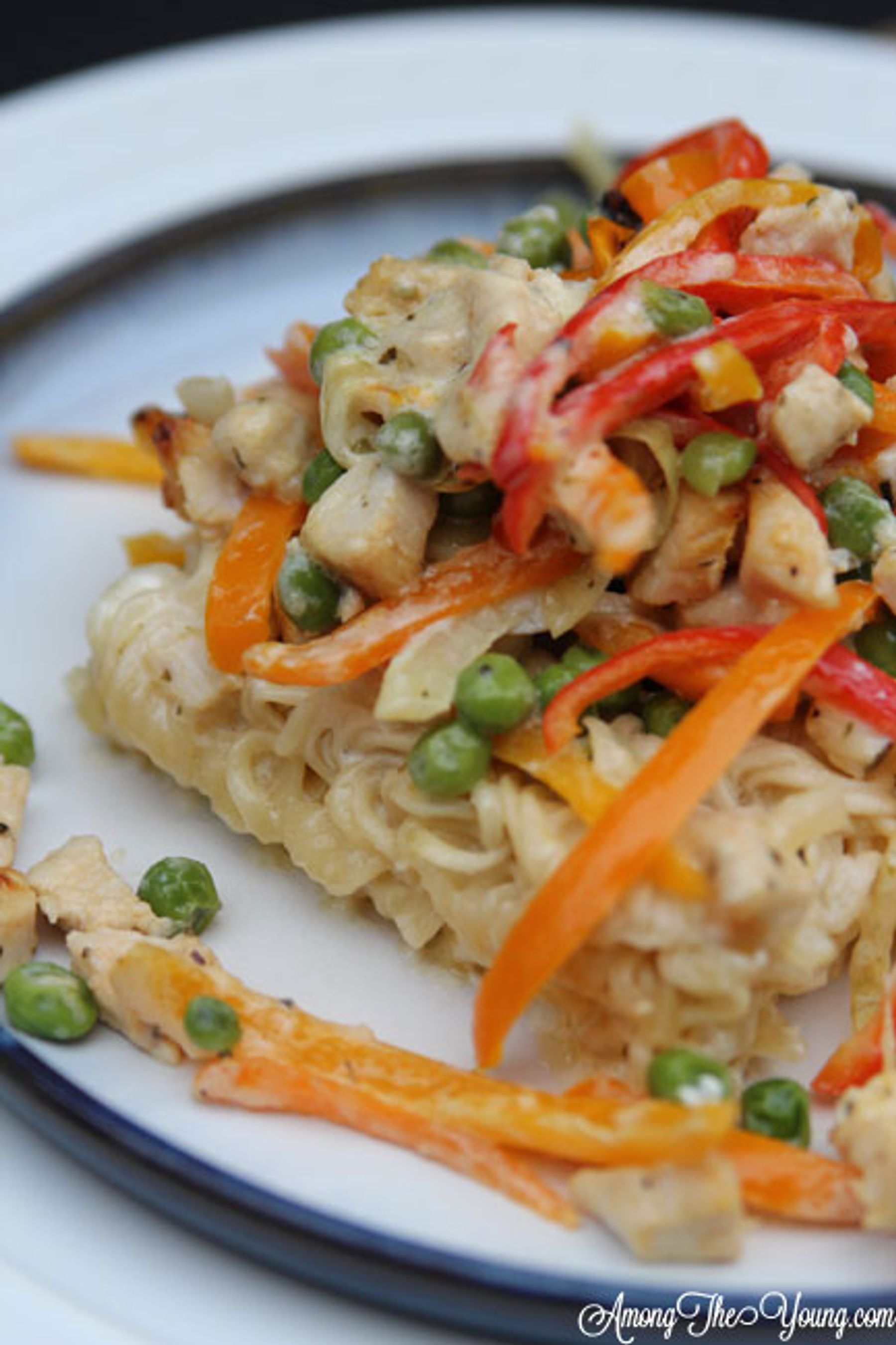 A super easy dish that can be thrown together with some Ramen, chicken, veggies, and leftover alfredo Sauce. (Refer to my Copycat Olive Garden Alfredo Dish HERE: http://amongtheyoung.com/copycat-olive-garden-alfredo-sauce-recipe/).