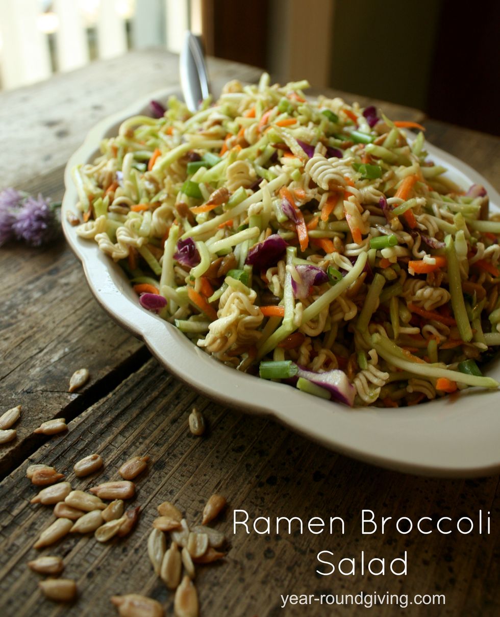 Broccoli slaw tossed with crunchy Ramen noodles in an Oriental dressing. Sunflower seeds and slivered almonds give the salad an extra crunch.