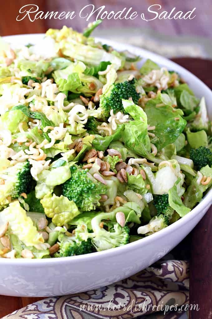 Romaine lettuce and broccoli are combined with crunchy Ramen noodles, sunflower seeds, and a sweet and tangy dressing in this unique and delicious salad.