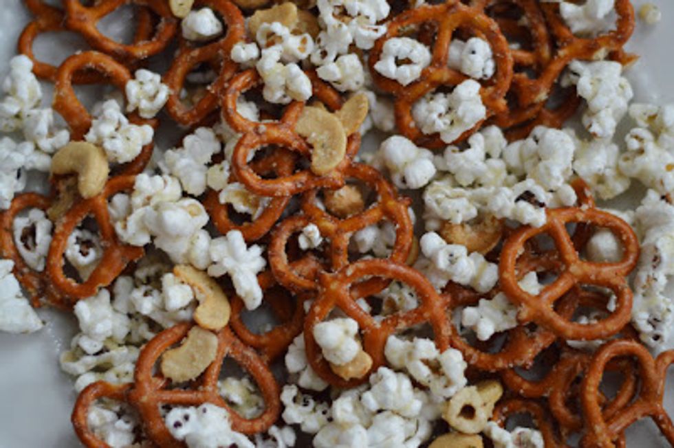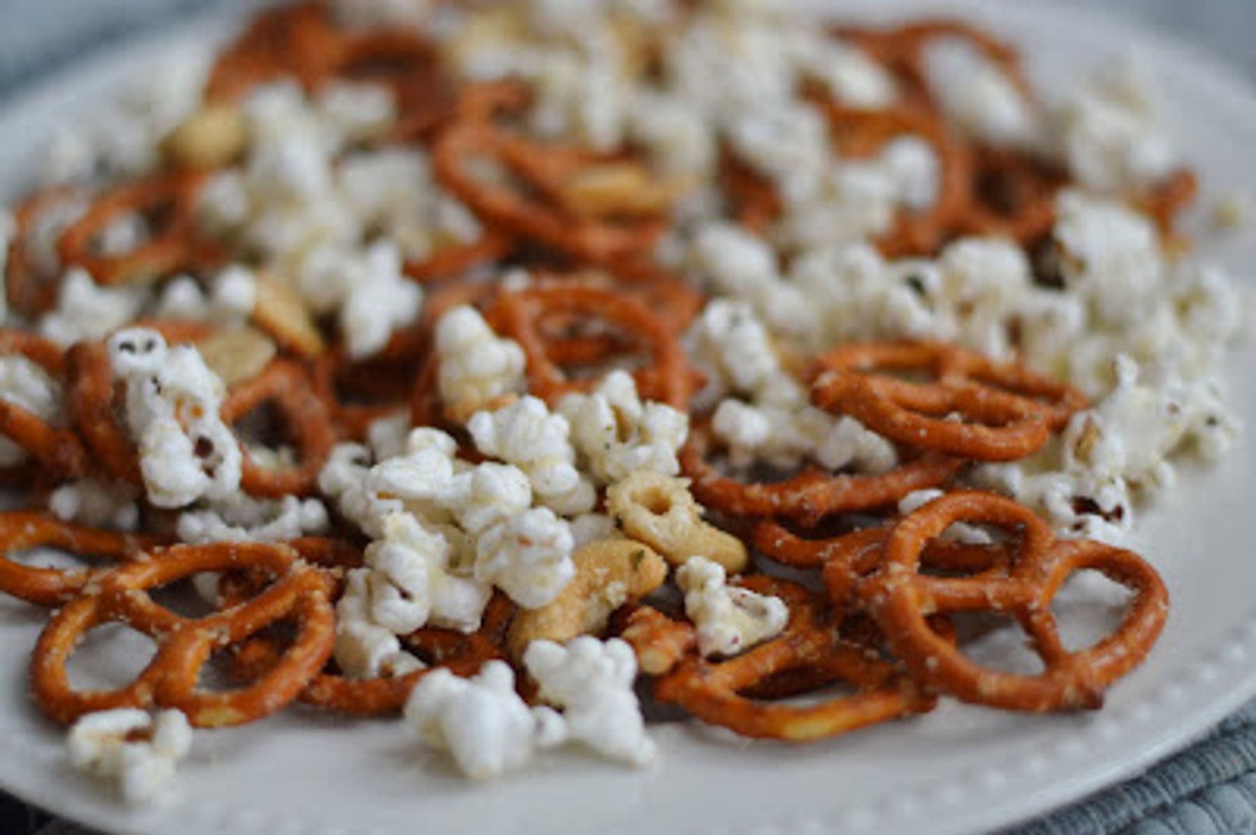 In a large microwave safe bowl, combine the oil and ranch mix. Stir. Add the popcorn, pretzels and cashews and toss to evenly coat the mixture. Heat on high for 1 minute, then stir, mixing from the...