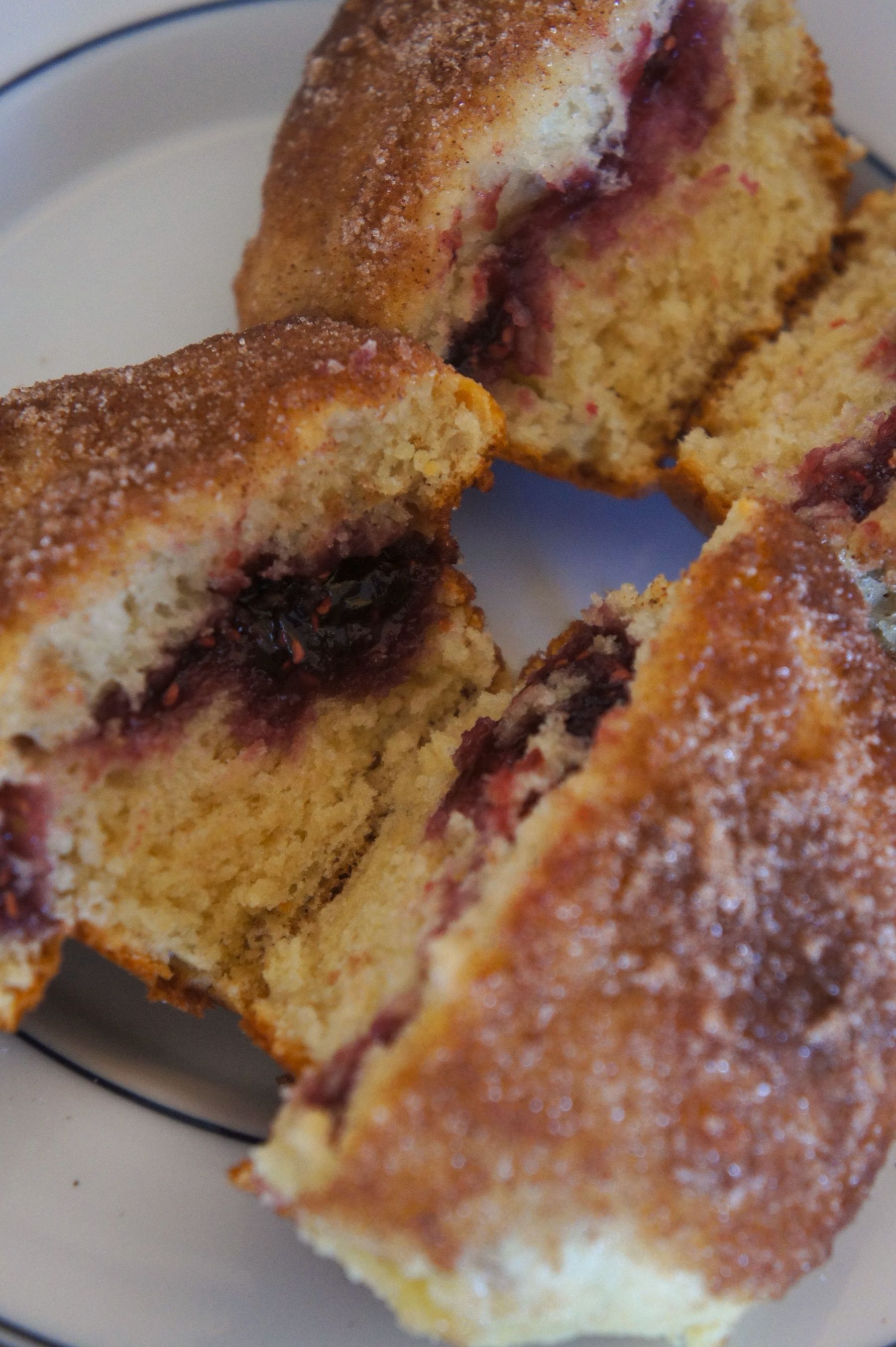 Almond muffins with raspberry jam in the middle and topped with cinnamon and sugar.