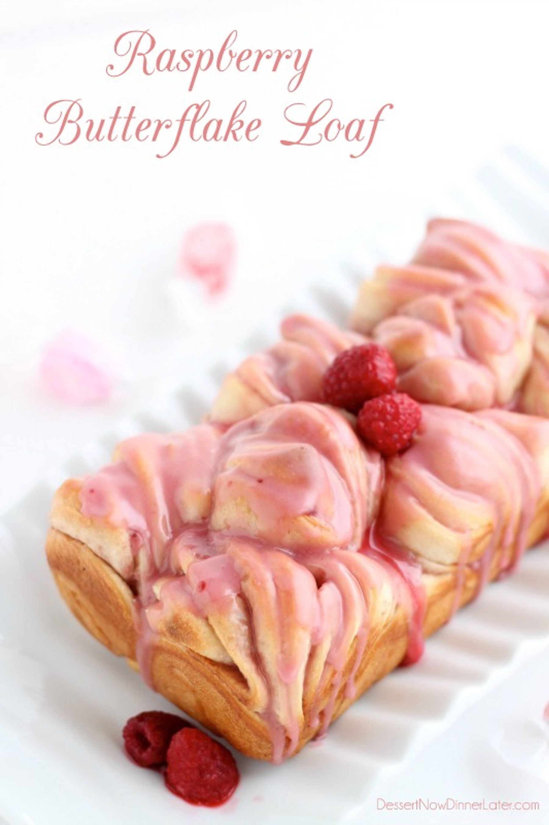 A layered yeast dough filled with butter and raspberry preserves all topped with a raspberry glaze.