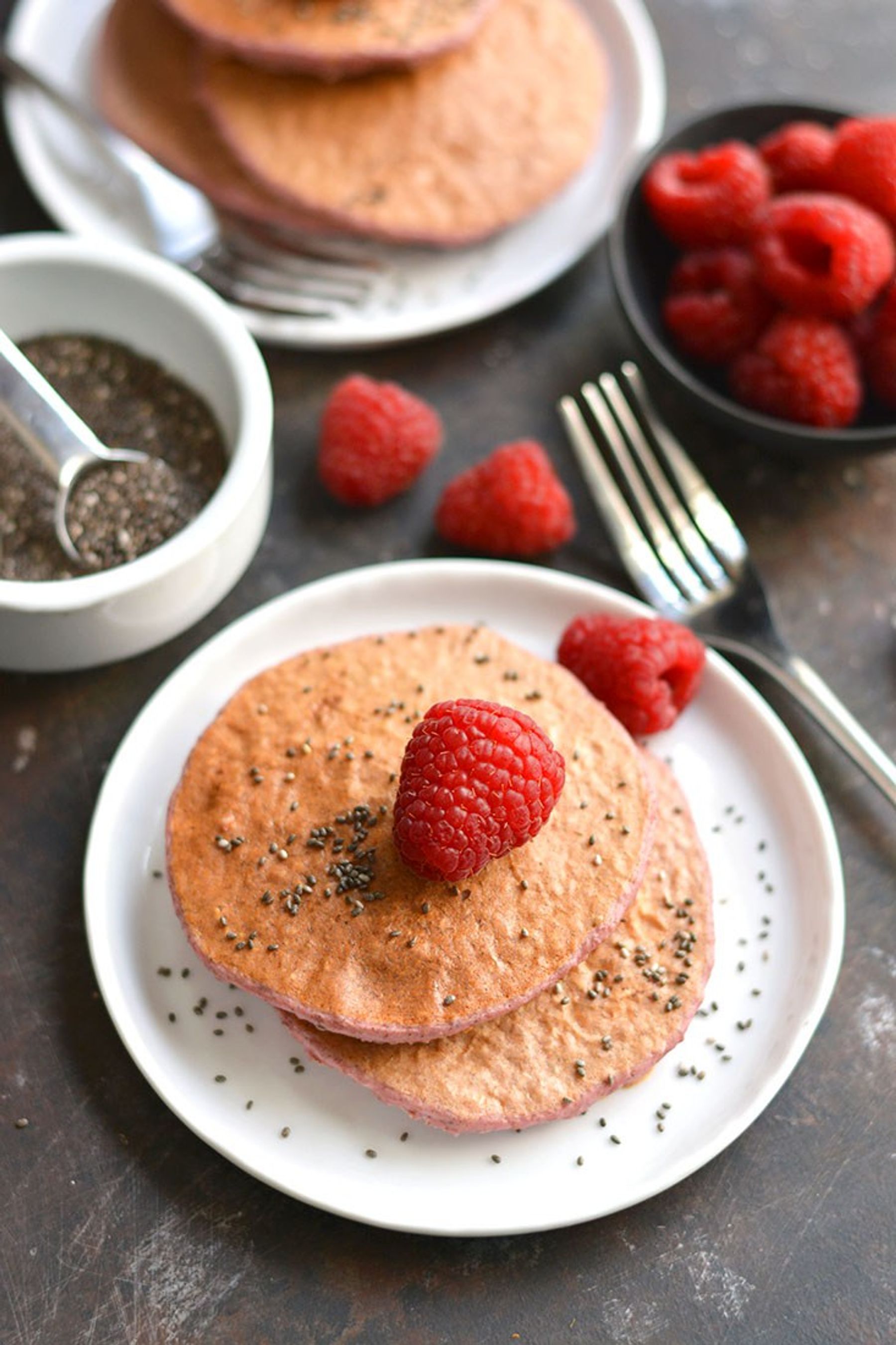 Raspberry Chia Protein Pancakes {GF, Low Calorie}