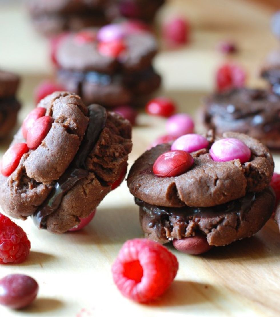 Chocolate sandwich cookies with raspberry M & M's and a raspberry fudge filling.