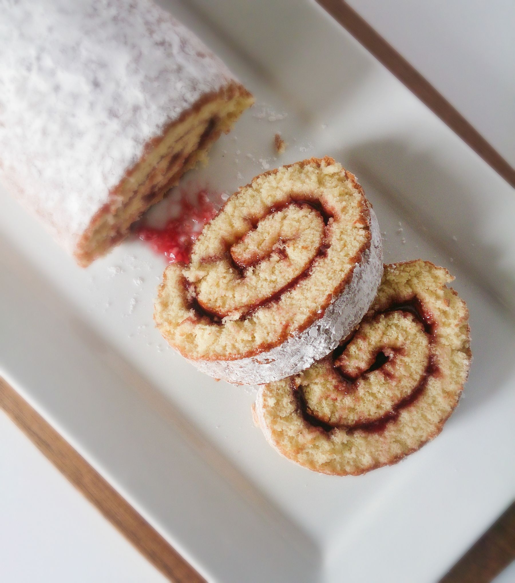 Soft and moist vanilla sponge cake, layered with raspberry jam and rolled up!