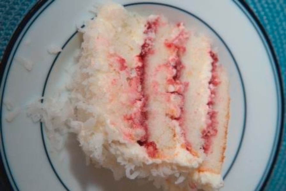 A moist and flavorful cake with lemon buttercream, raspberry preseves and covered in coconut.