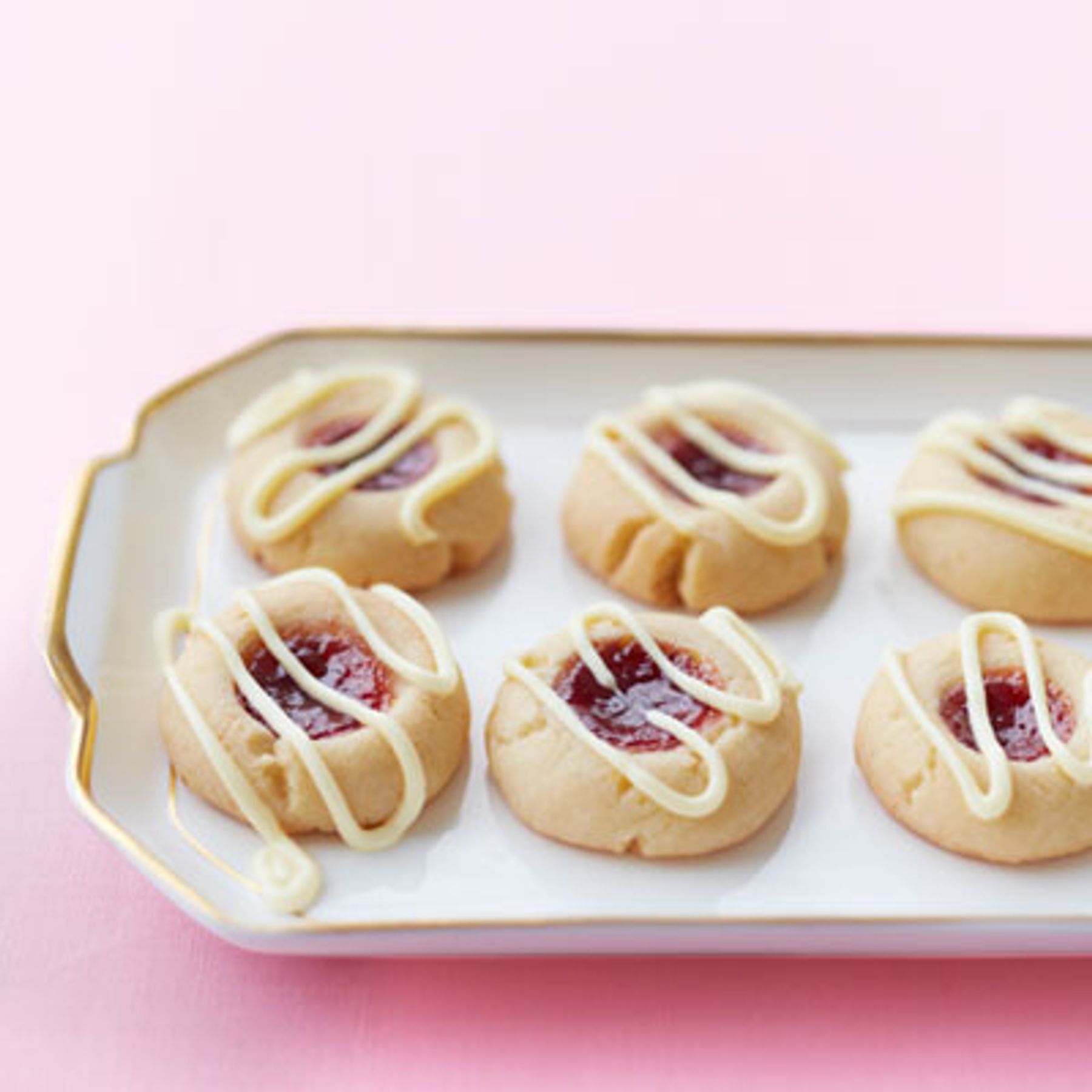 Gather dough into ball in bowl. Pinch off and roll dough into 1-inch balls. Arrange 1 inch apart on cookie sheets; make indentation in center of each using floured index finger. Fill each with scant 1/2 teaspoon jam mixture. Bake 20 minutes or until golden. Cool completely on wire racks. Drizzle with melted white chocolate. Let set. (Refrigerate if necessary.) Store cookies in airtight container layered with waxed paper in freezer up to 1 month.