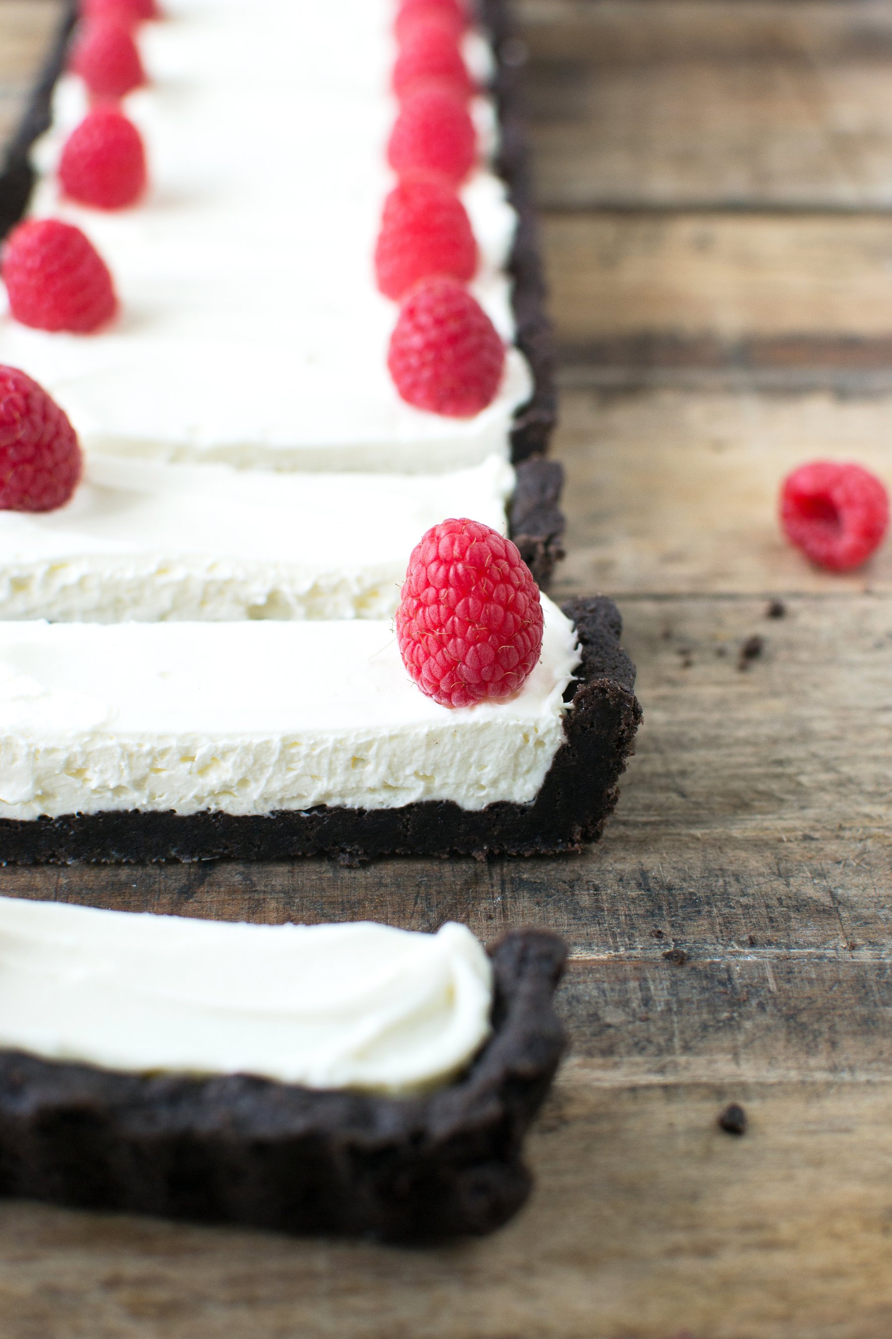 A dark chocolate cookie crust filled with whipped mascarpone and topped with raspberries. Perfect for Valentine’s Day!