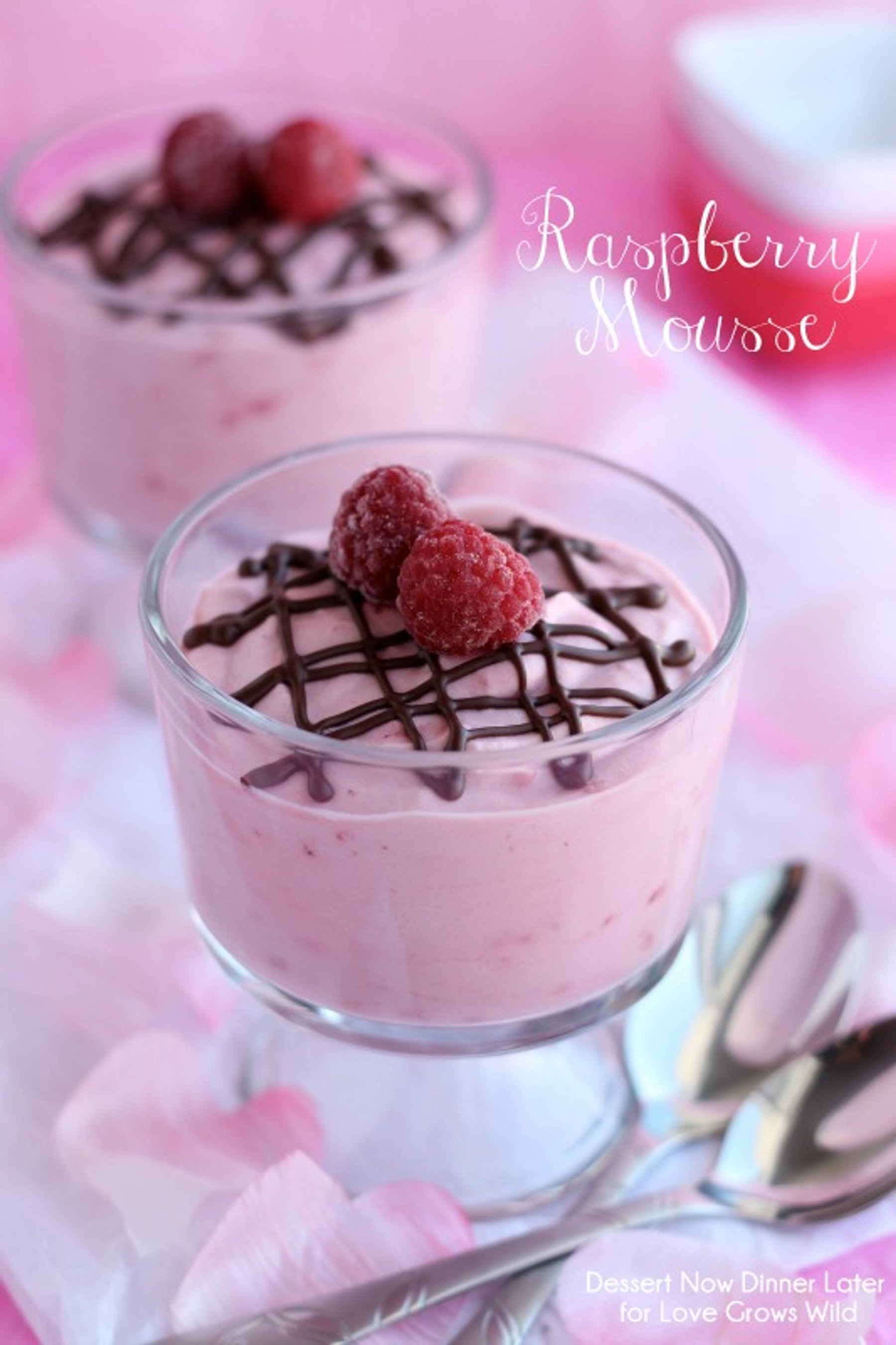 This Raspberry Mousse is velvety and light in texture topped with a decadent chocolate drizzle. The perfect dessert for a romantic date night any time of year!