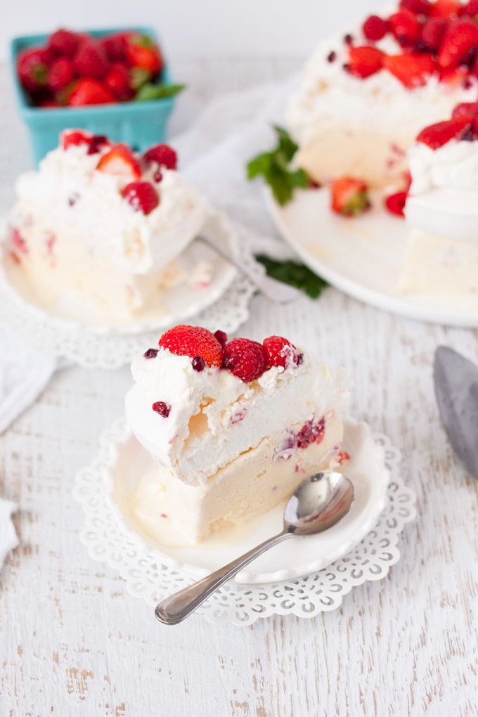 Perfect homemade Pavlova perched atop a creamy, homemade Raspberry Ice Cream base. This Raspberry Pavlova Ice Cream Cake is sublime