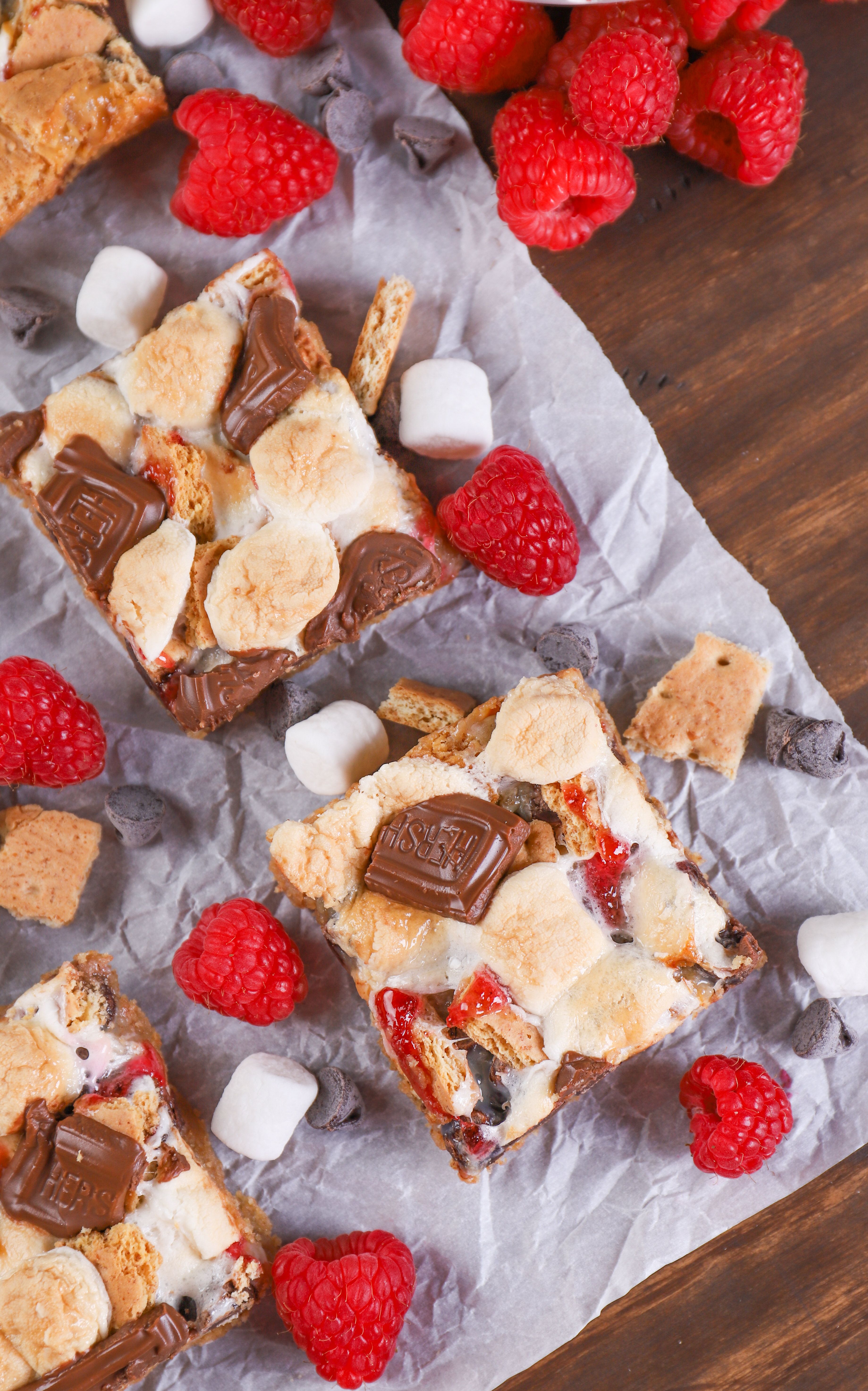 These Raspberry S'mores Seven Layer Bars have all the flavor of a gooey s'more with the fruity addition of raspberry preserves! Sweet and salty graham cracker crust and pieces, combined with toasted marshmallows, swirls of raspberry, and pockets of melty chocolate!