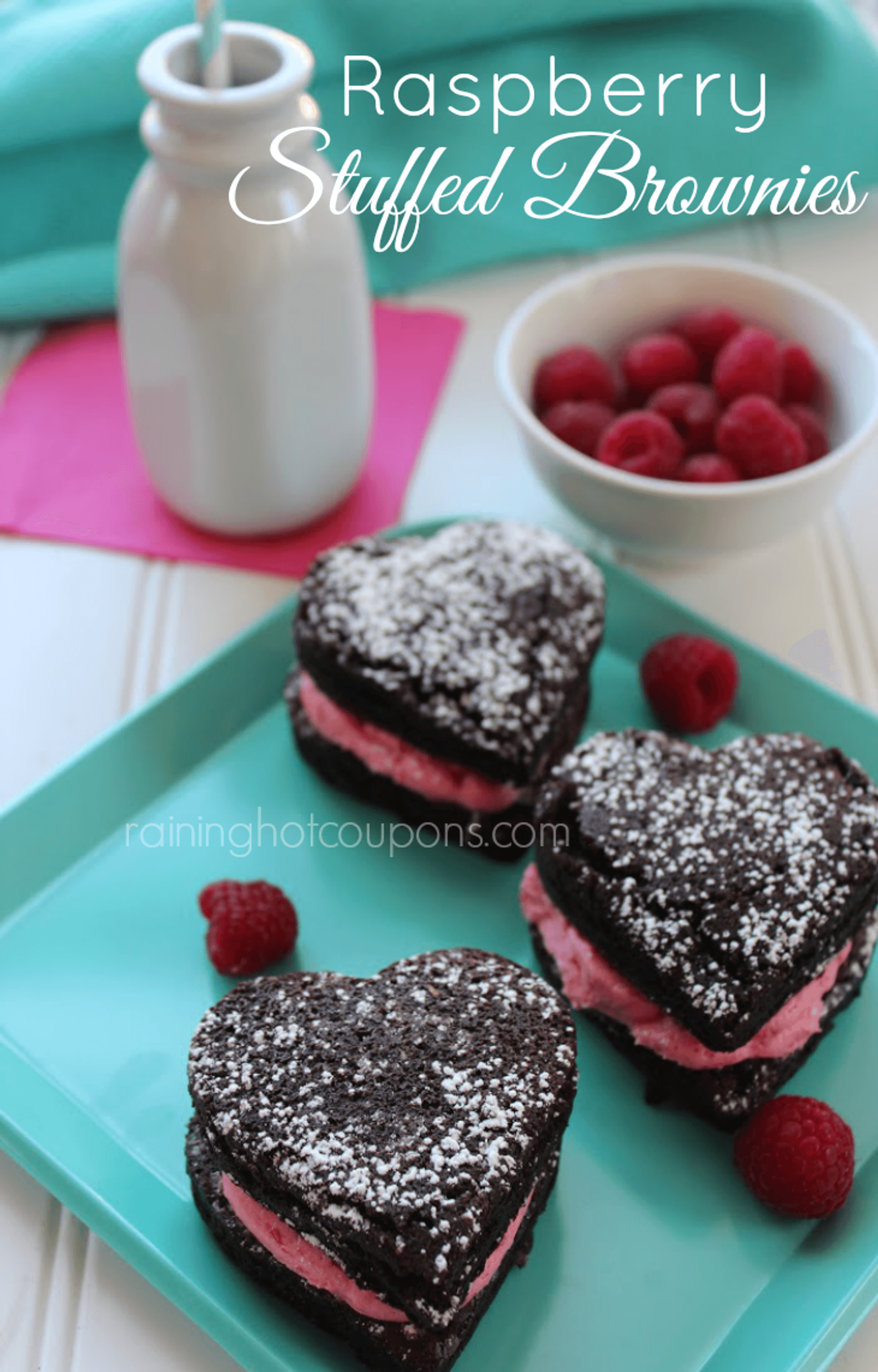 If you are looking for a super yummy treat for Valentine’s Day then I have the perfect recipe for you. These brownie hearts are stuffed with a creamy, raspberry filling that comes out a beautiful pink color. Then the brownies are lightly covered with powdered sugar which makes them a little sweeter and delicious. Enjoy this unique treat…