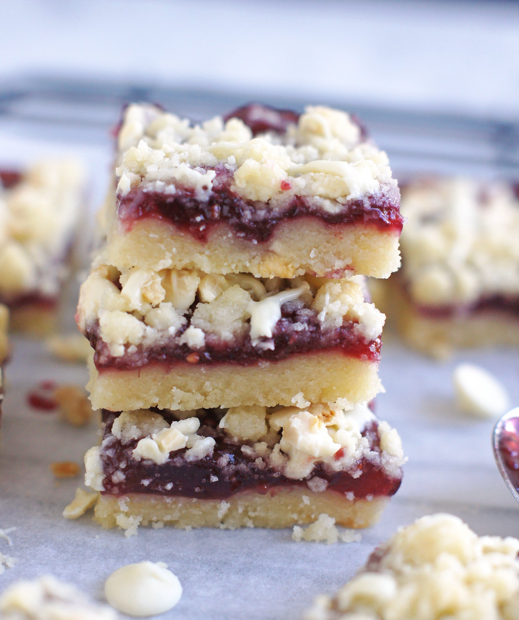 A buttery shortbread crust topped with raspberry jam and white chocolate chips, these Raspberry White Chocolate Bars are divine!