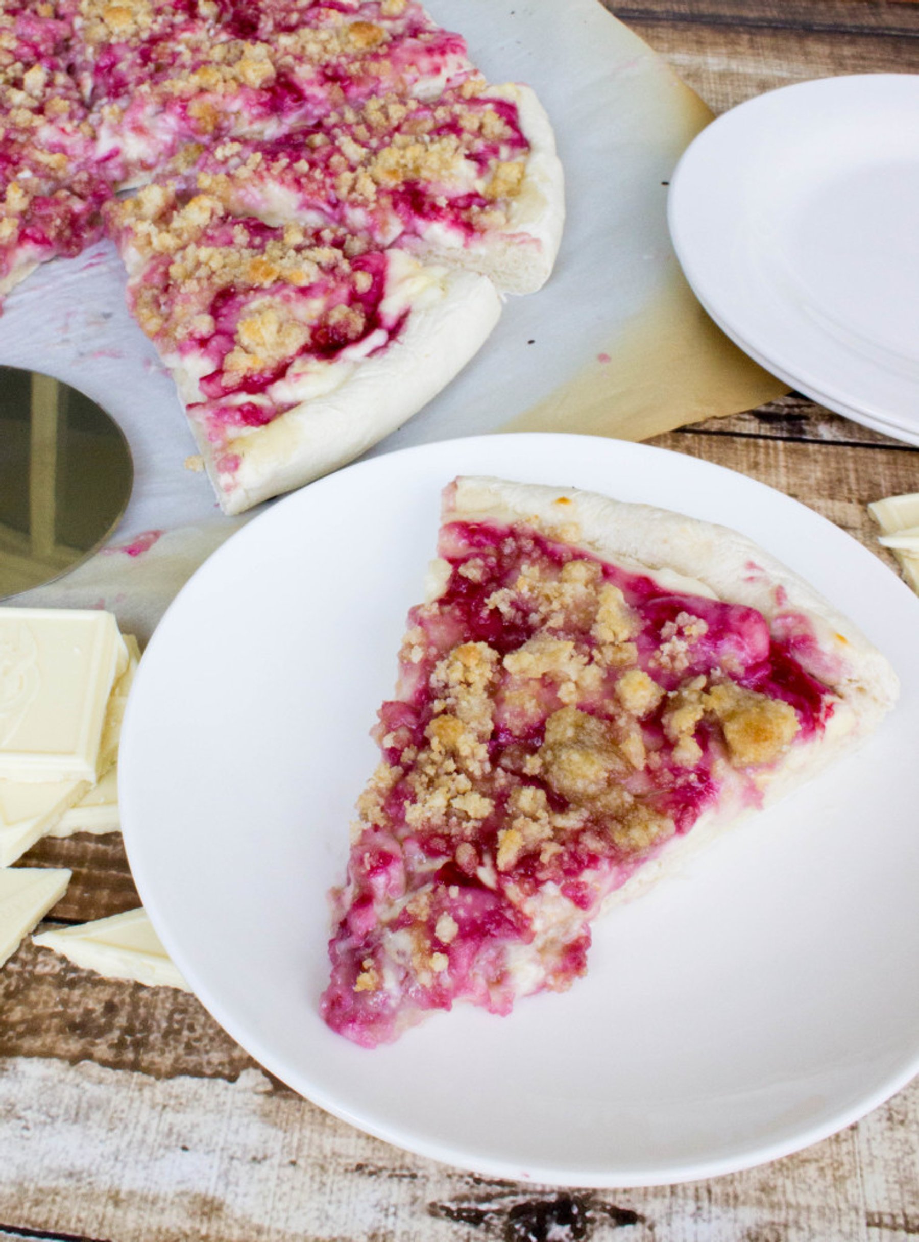 A unique dessert pizza made with finely chopped white chocolate and a cream cheese based”sauce” with a fresh raspberry swirl and crispy-sweet streusel topping.