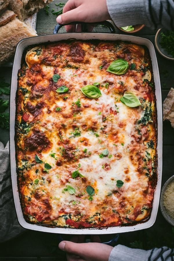 This easy Ravioli Lasagna with ricotta and spinach goes straight from the freezer to the oven in just minutes! There's no need to boil the ravioli first -- just layer the stuffed pasta with cheese, veggies, and marinara sauce, then bake it until bubbly. The hearty and satisfying vegetarian casserole tastes like lasagna! Serve the baked ravioli alongside garlic bread and a simple green salad for an easy weeknight dinner.