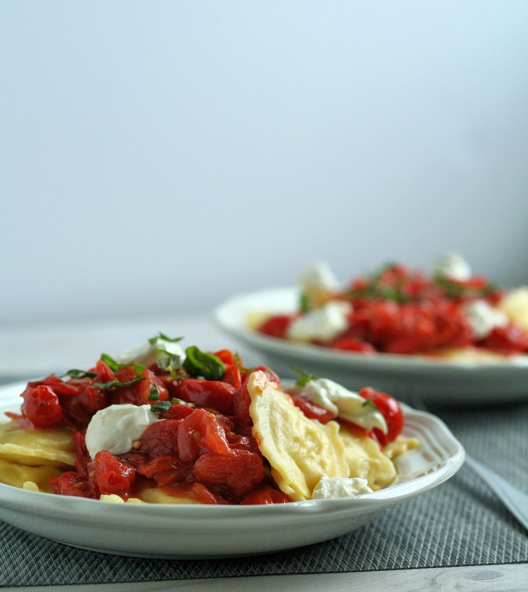 The quickest, easiest, fresh lunch option available: Cheese Ravioli with a broiled tomato mixture, topped with cheese.