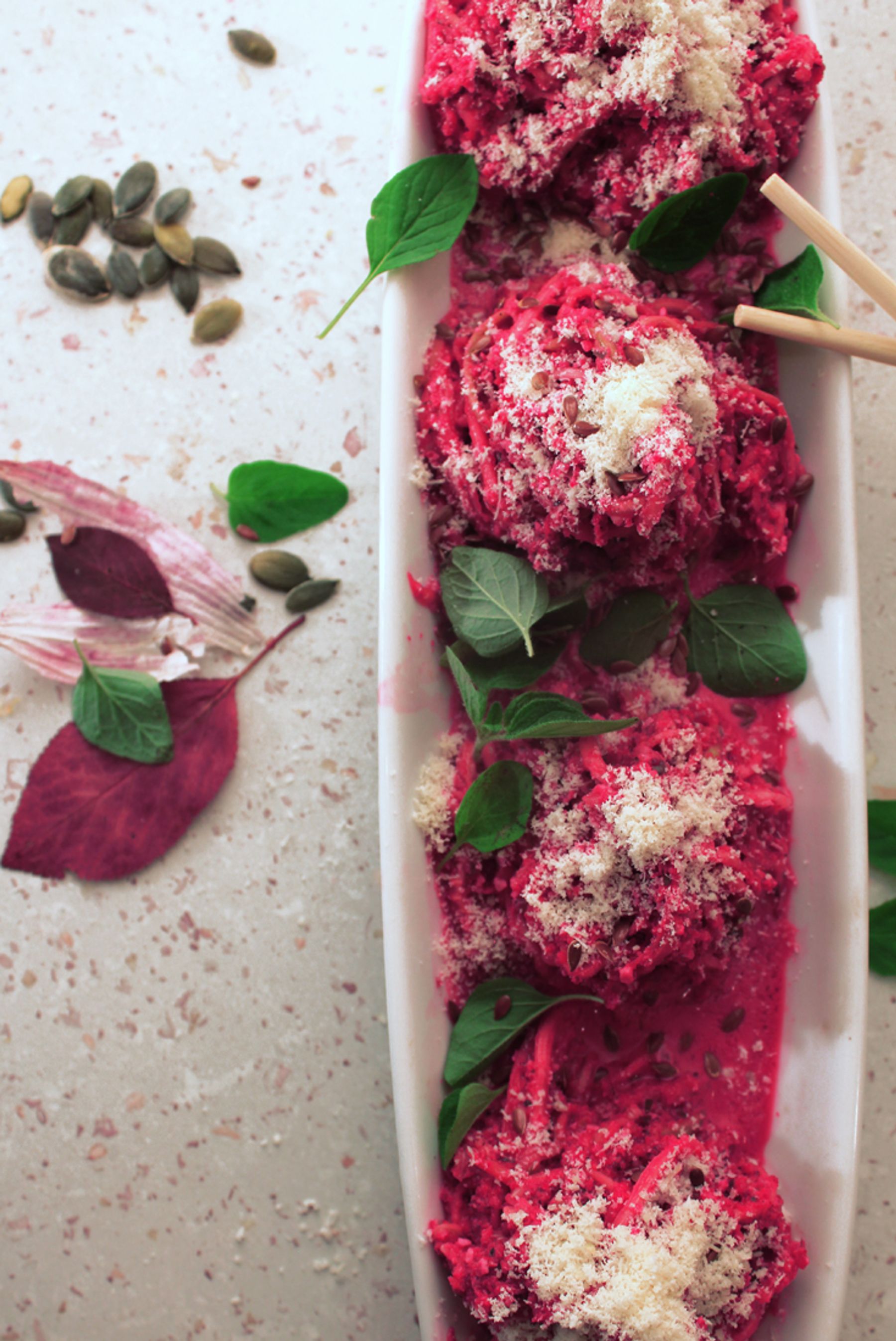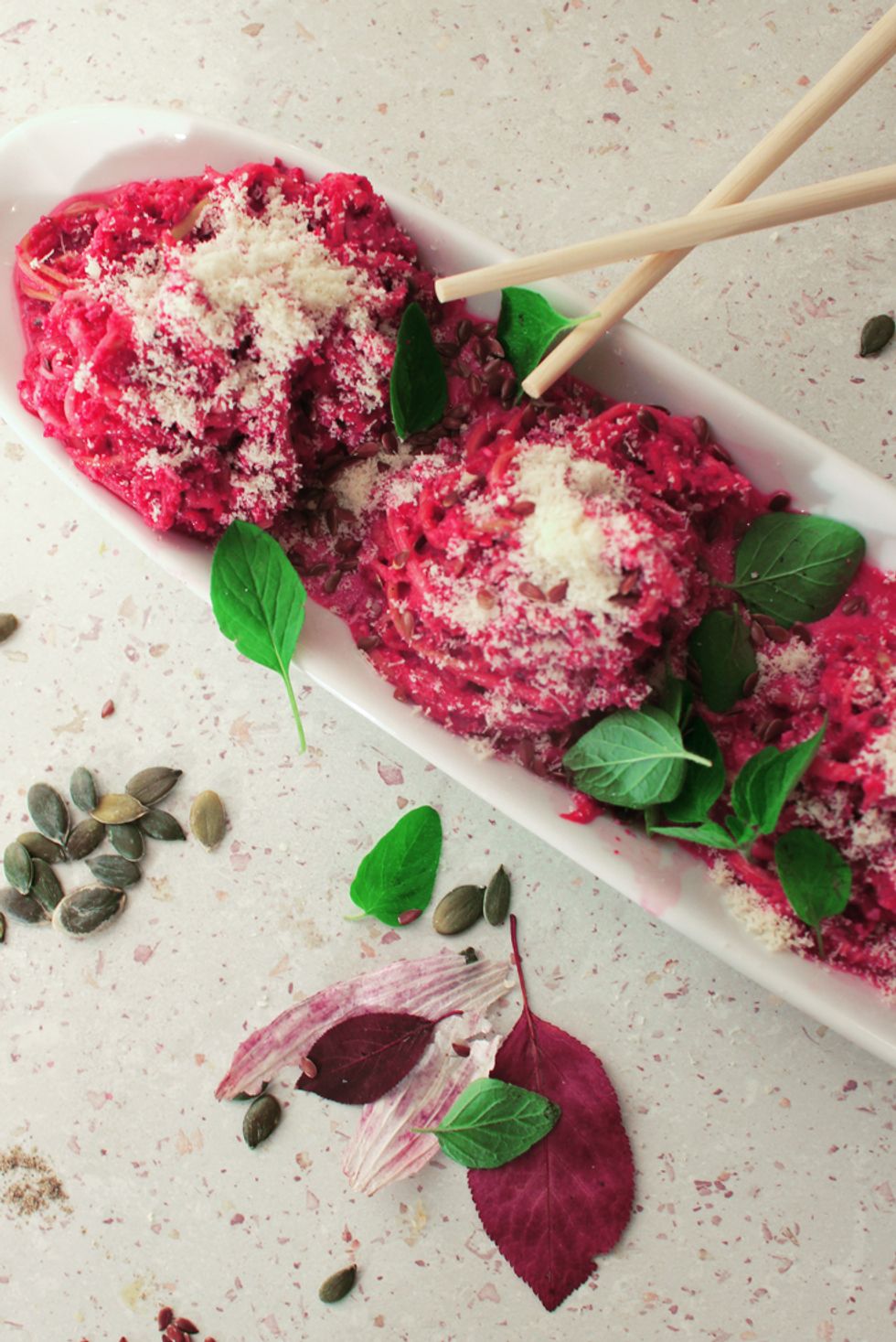 Raw Beetroot Zucchini Pasta – this colorful recipe is all about beautiful raw and healhty food. Beetroot, a veggie I always knew to be a great source of iron, is also known to be full of vitamins A and C, minerals, fibre, calcium, glutamine. Beet is also natural antioxidants. In this recipe we\\\'ll try to take most of its benefits for our health. Try also eating it raw in salads (I always try to avoid cooking it) and be careful while peeling it - this is one powerful color ;) Pumpkin seeds