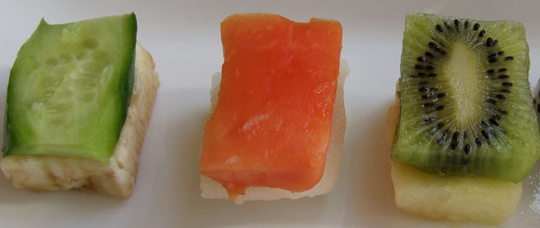 This is a raw vegan version of “nigiri sushi. Make everything with fruits as they are so colorful.