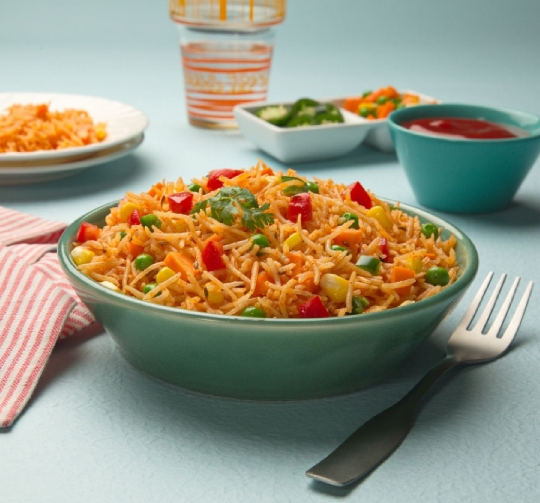 Cook restaurant style Mexican rice at home. Softly spiced long grain rice with sweetness of corn, peas and carrots.