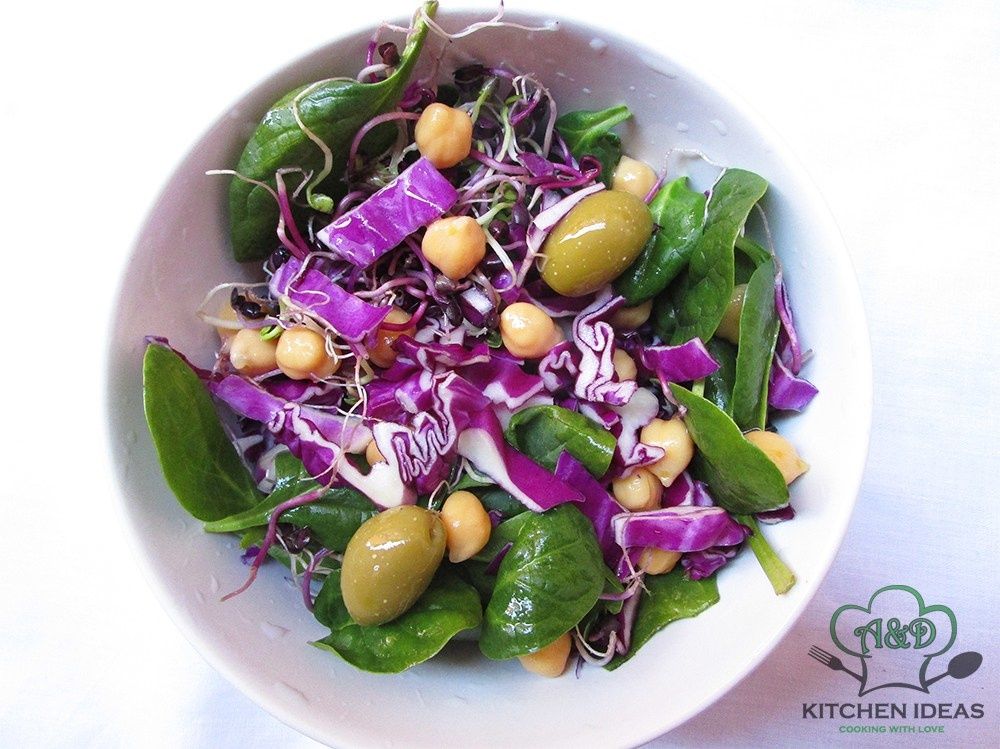 - Add all the dry ingredients (cabbage, spinach, radish sprouts, olives, and chickpeas) to a mixing bowl.