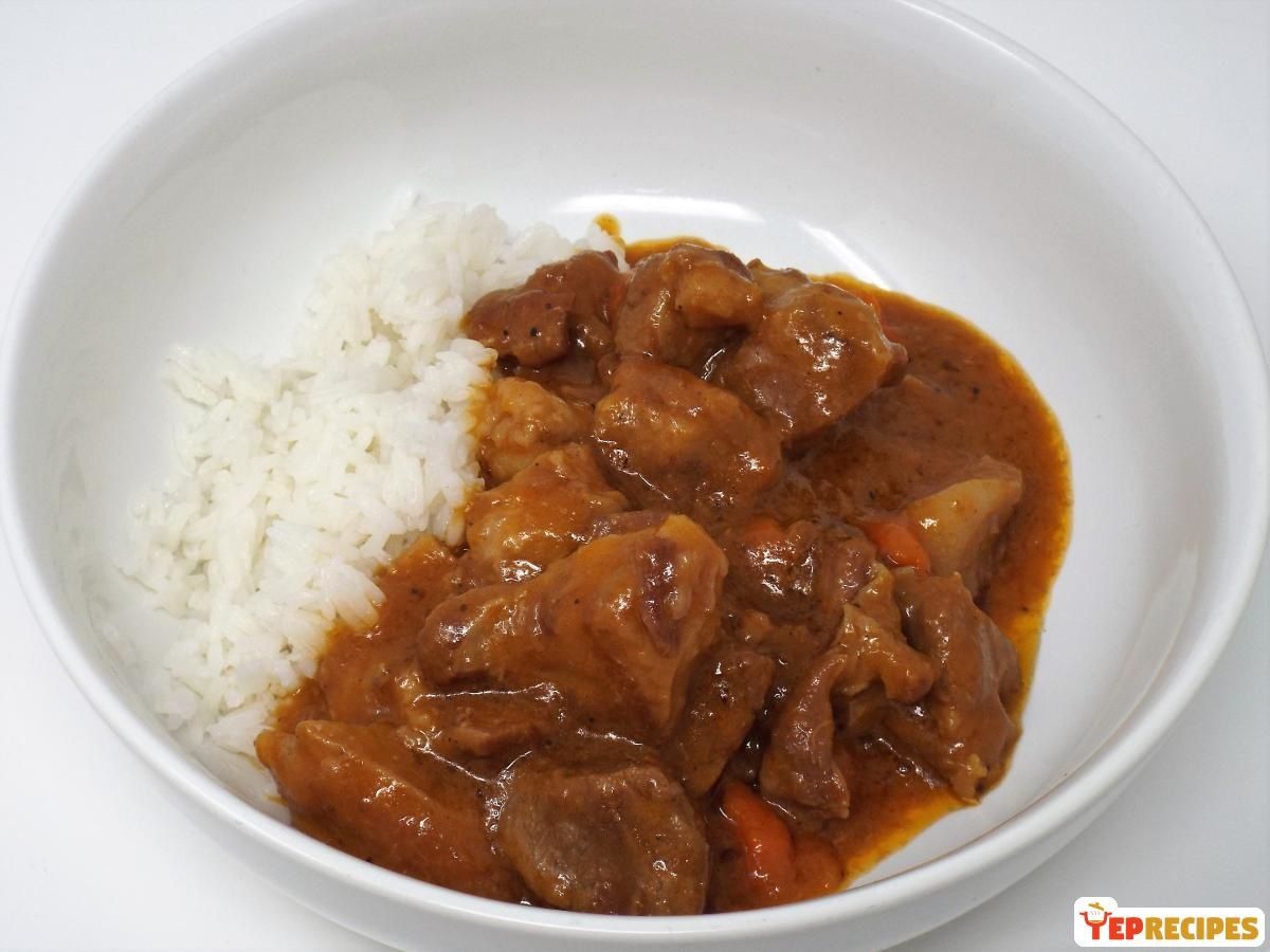 Pork shoulder braised in a homemade Thai-style red curry paste with carrots and coconut milk then served over steamed jasmine rice.