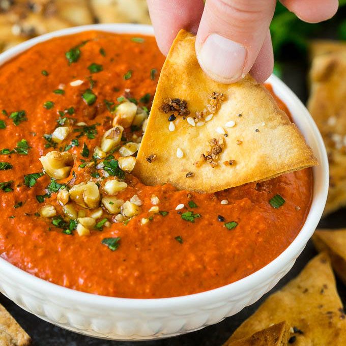 This muhammara recipe is a creamy roasted red pepper and walnut dip that's full of flavor. Serve it with pita chips or vegetables for an easy yet unexpected make-ahead appetizer.
