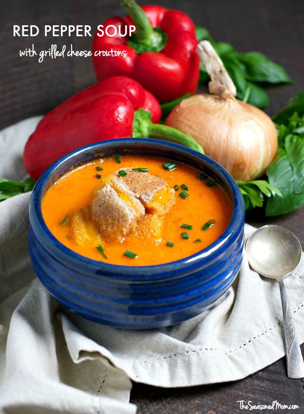 Served at room temperature on a warm day or served warm on a cool late summer evening, this Red Pepper Soup with Grilled Cheese Croutons is an easy and healthy vegetarian lunch or dinner option for every season!